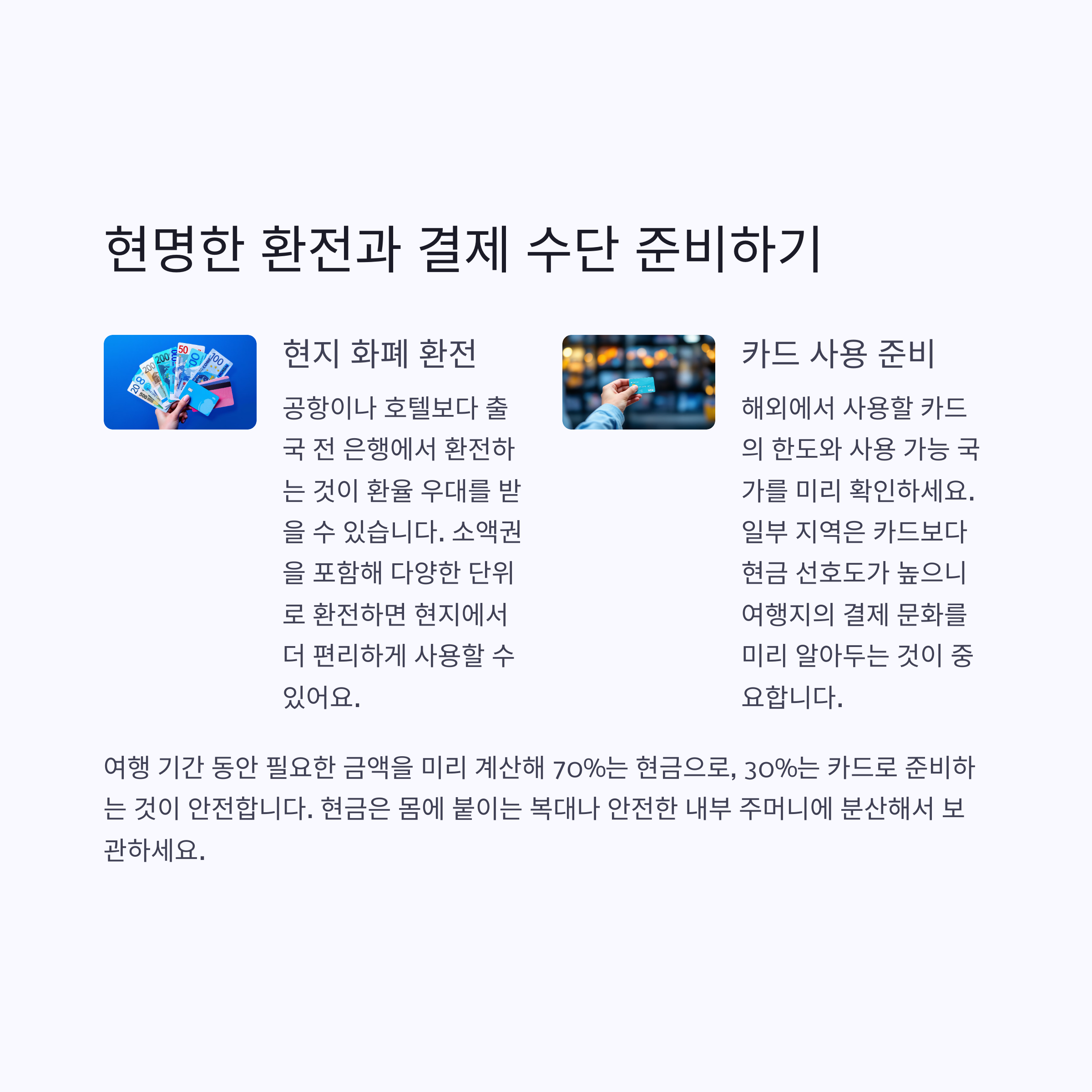 특히 동남아나 유럽 일부 국가는 카드보다 현금 사용 비율이 높다는 점을 기억하세요.