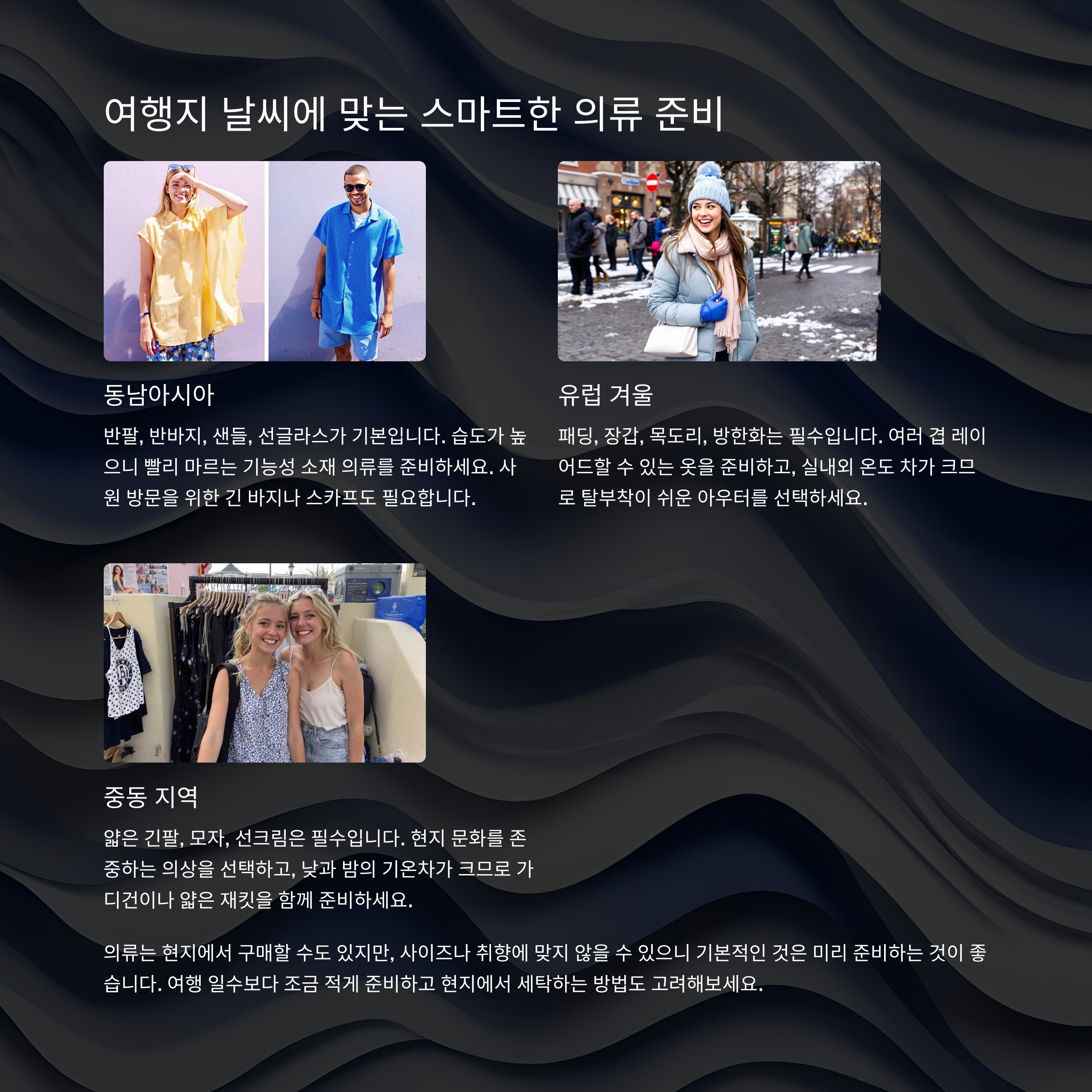 여행지의 계절과 날씨에 맞춰 의류를 준비하는 것이 중요합니다.