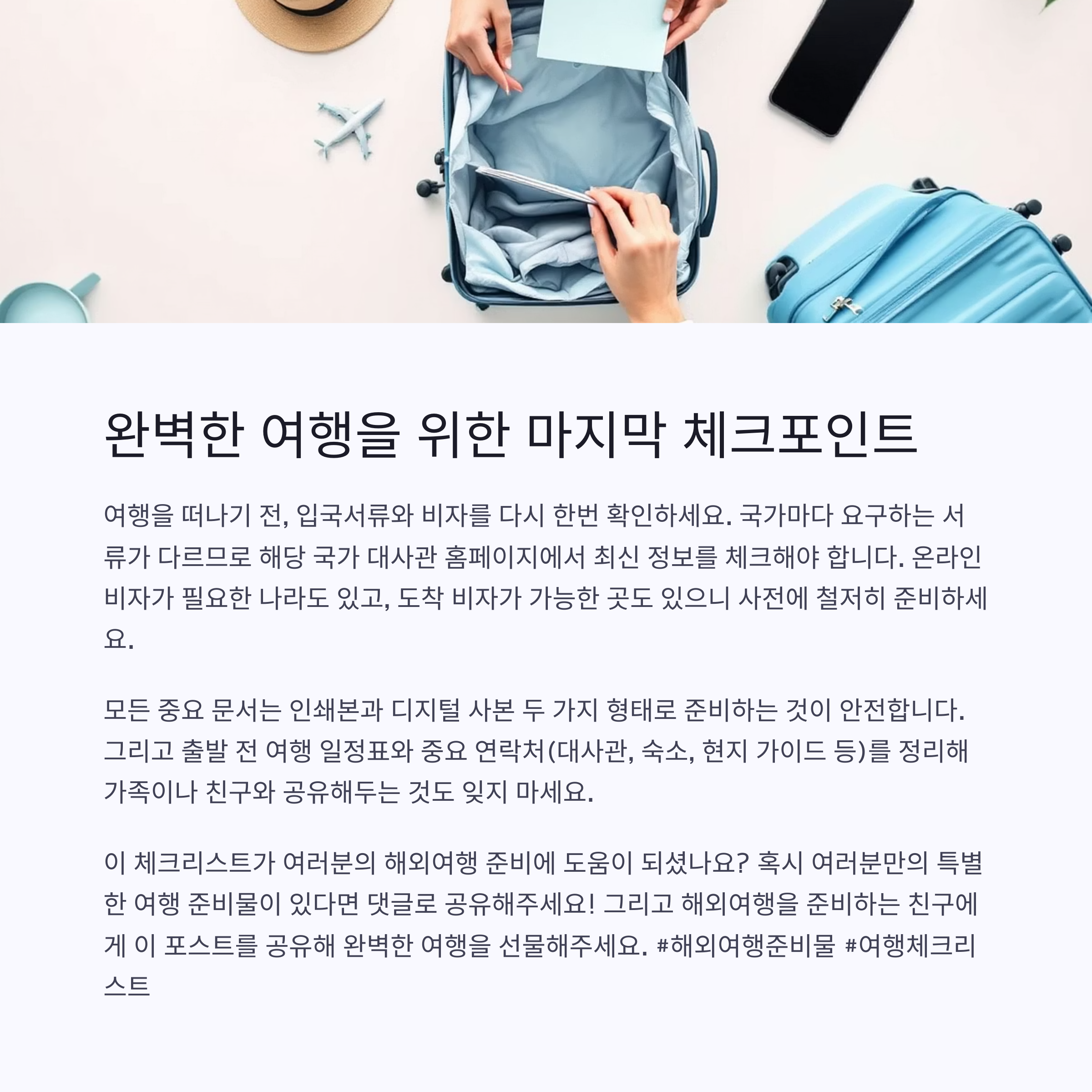 빠뜨리는 물건 하나로도 여행의 질이 바뀔 수 있기에 꼼꼼한 체크가 중요합니다.
