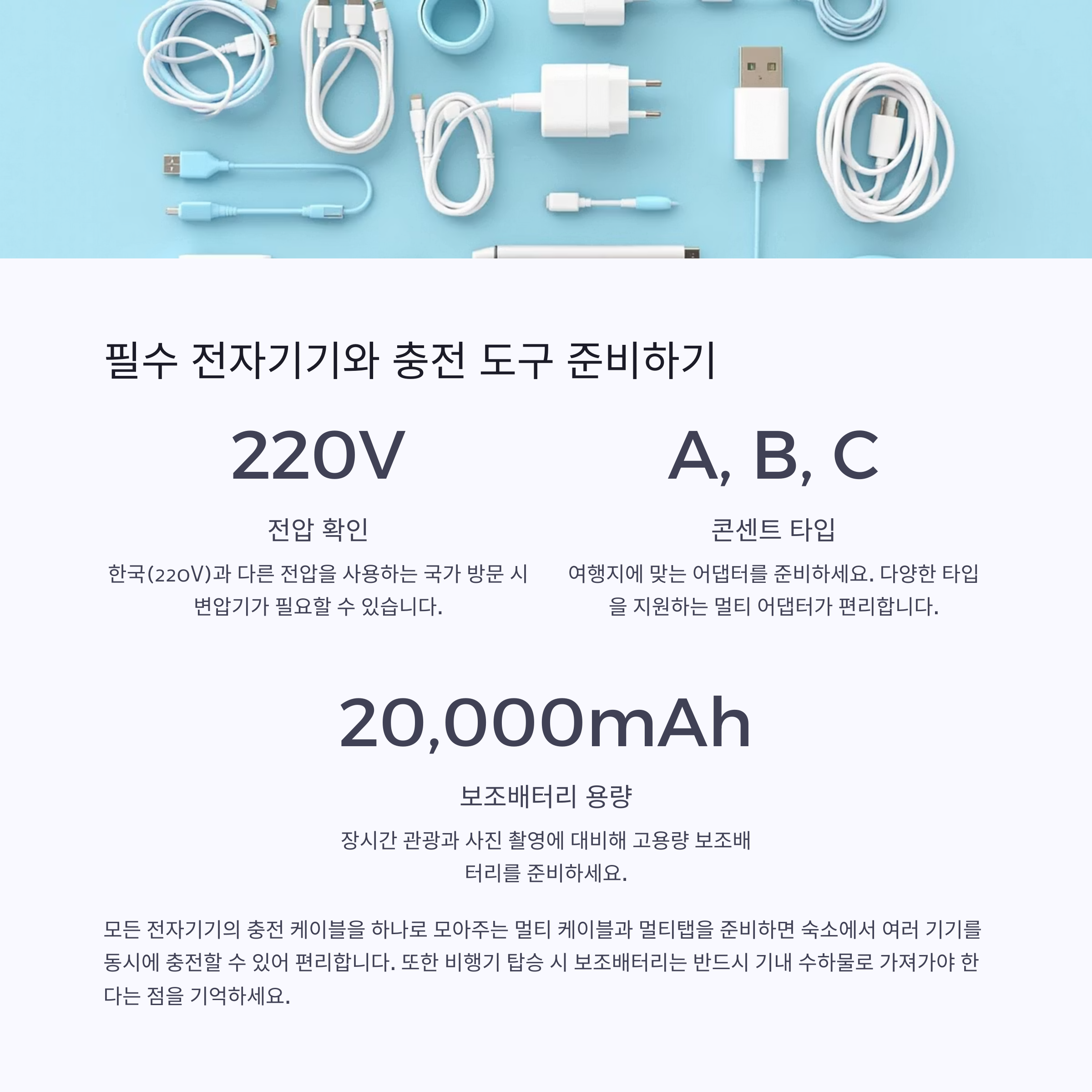 또한 공항 대기 시간이나 장거리 이동 시 사용할 보조배터리도 필수입니다.
