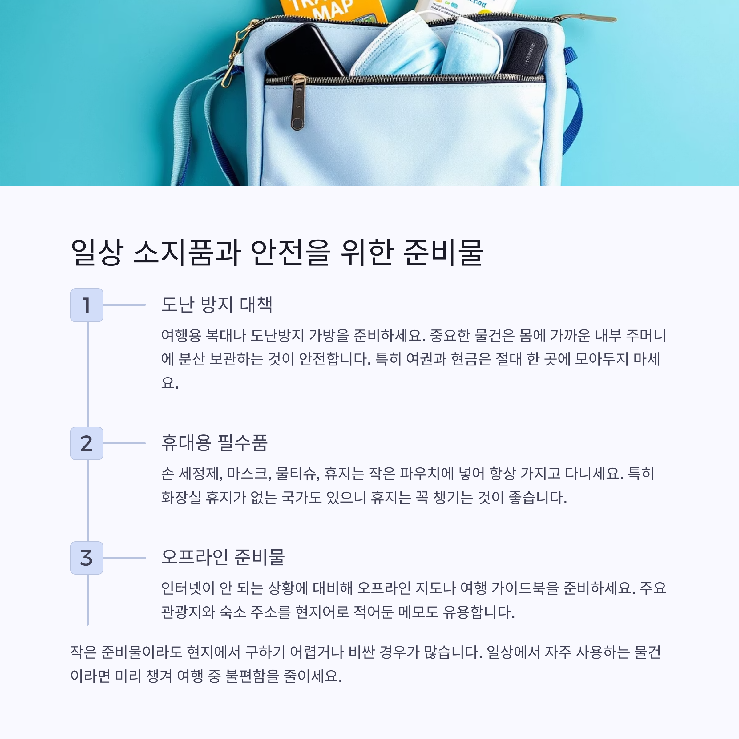 특히 도난에 대비해 복대나 안쪽 주머니를 활용하는 것이 안전합니다.