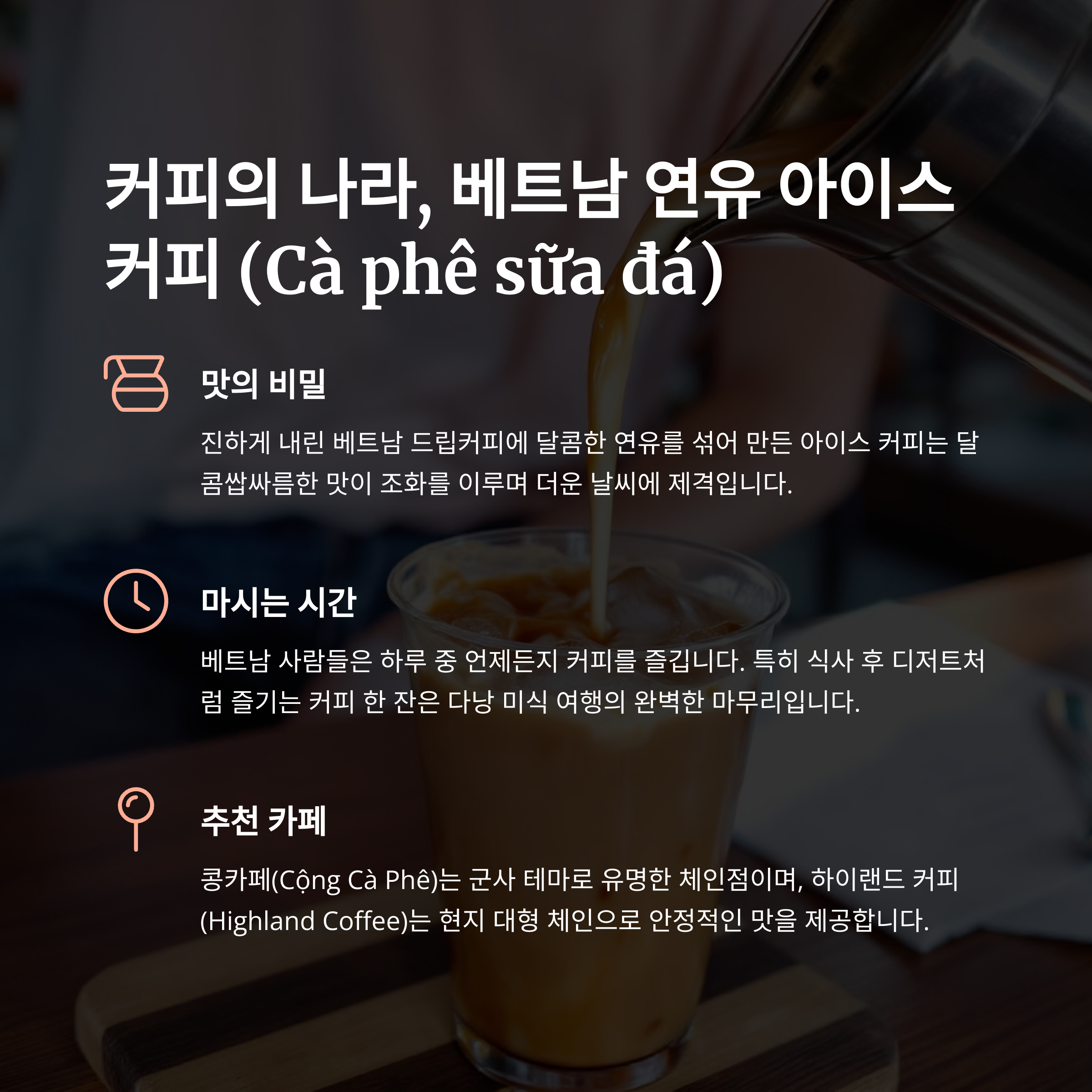 진하게 내린 베트남 드립커피에 연유를 섞어 만든 아이스커피는