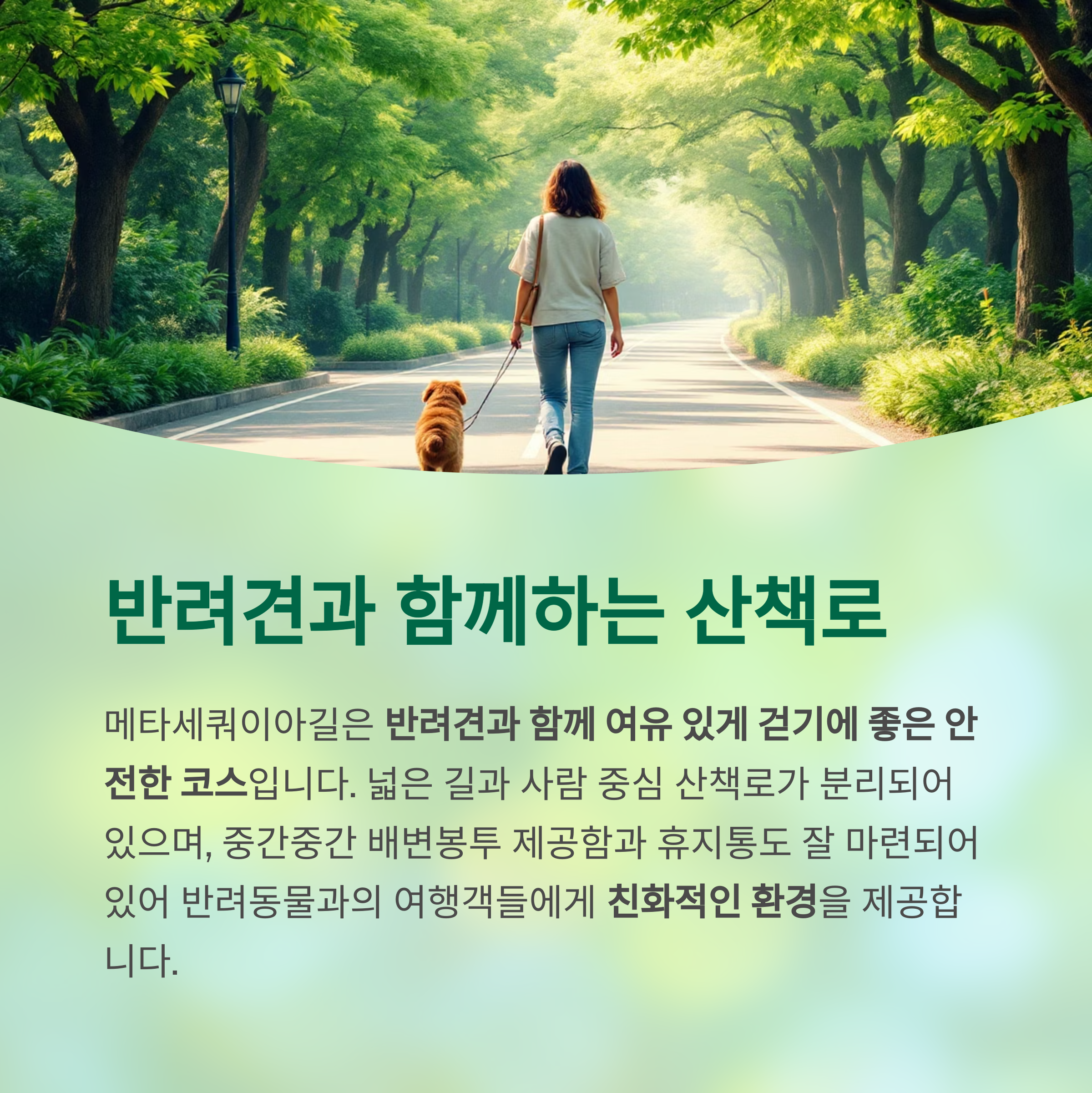 반려견과 함께 여유 있게 걷기에 좋은 안전한 코스입니다.