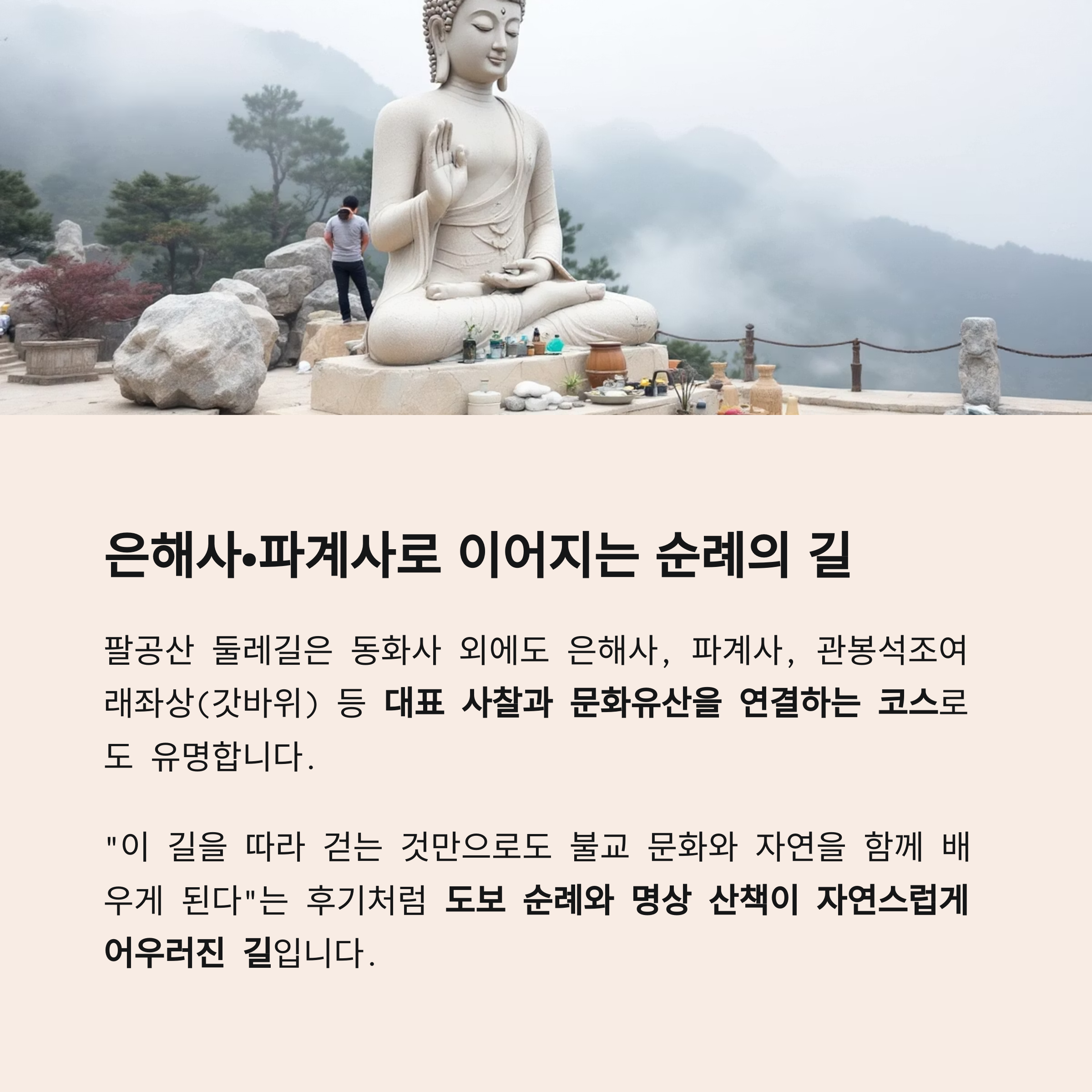 그중에서도 팔공산 둘레길은 여러 사찰과 숲길, 문화유산을 잇는