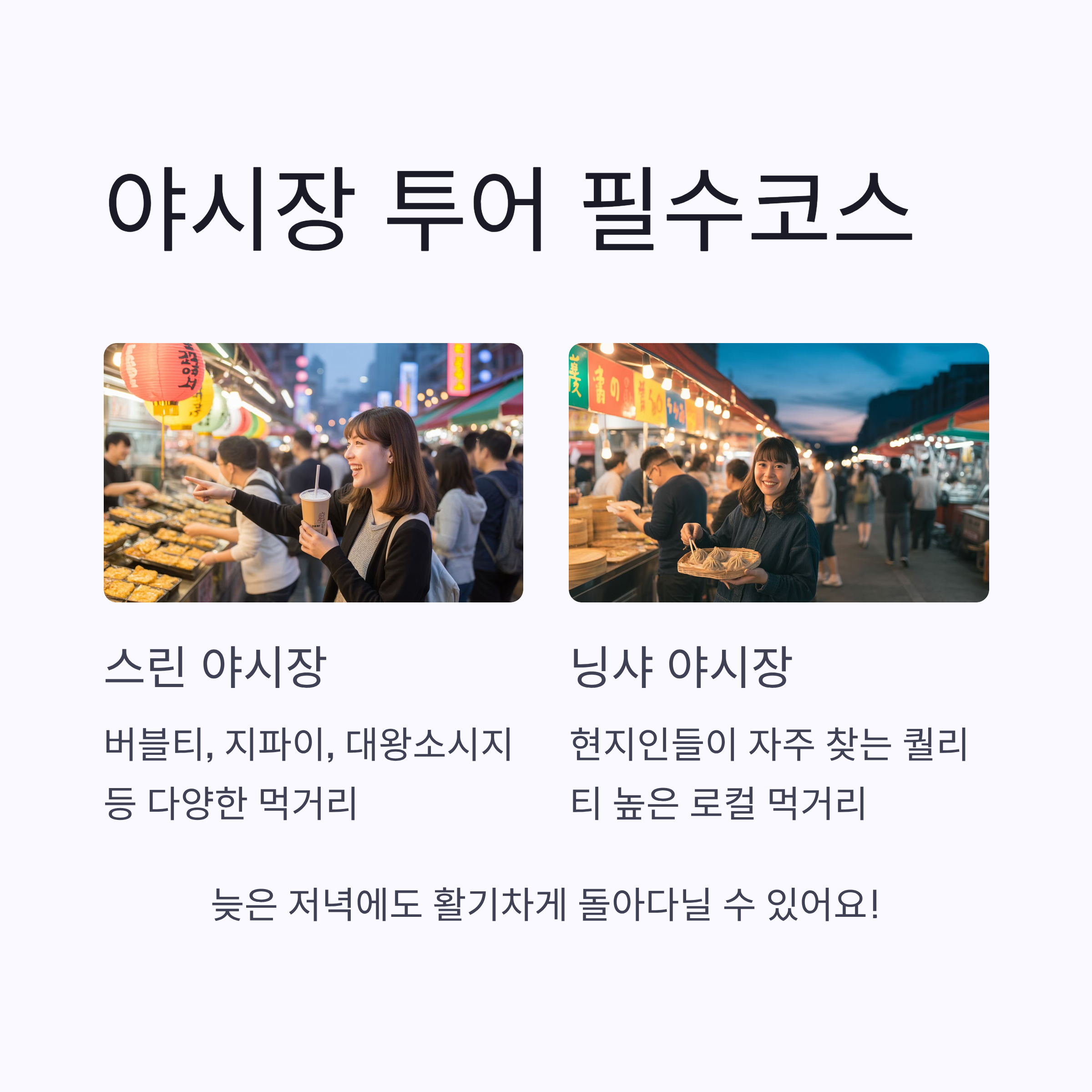닝샤 야시장은 비교적 작지만 퀄리티 높은 로컬 먹거리가 많아 현지인들도 자주 찾는 곳이에요.