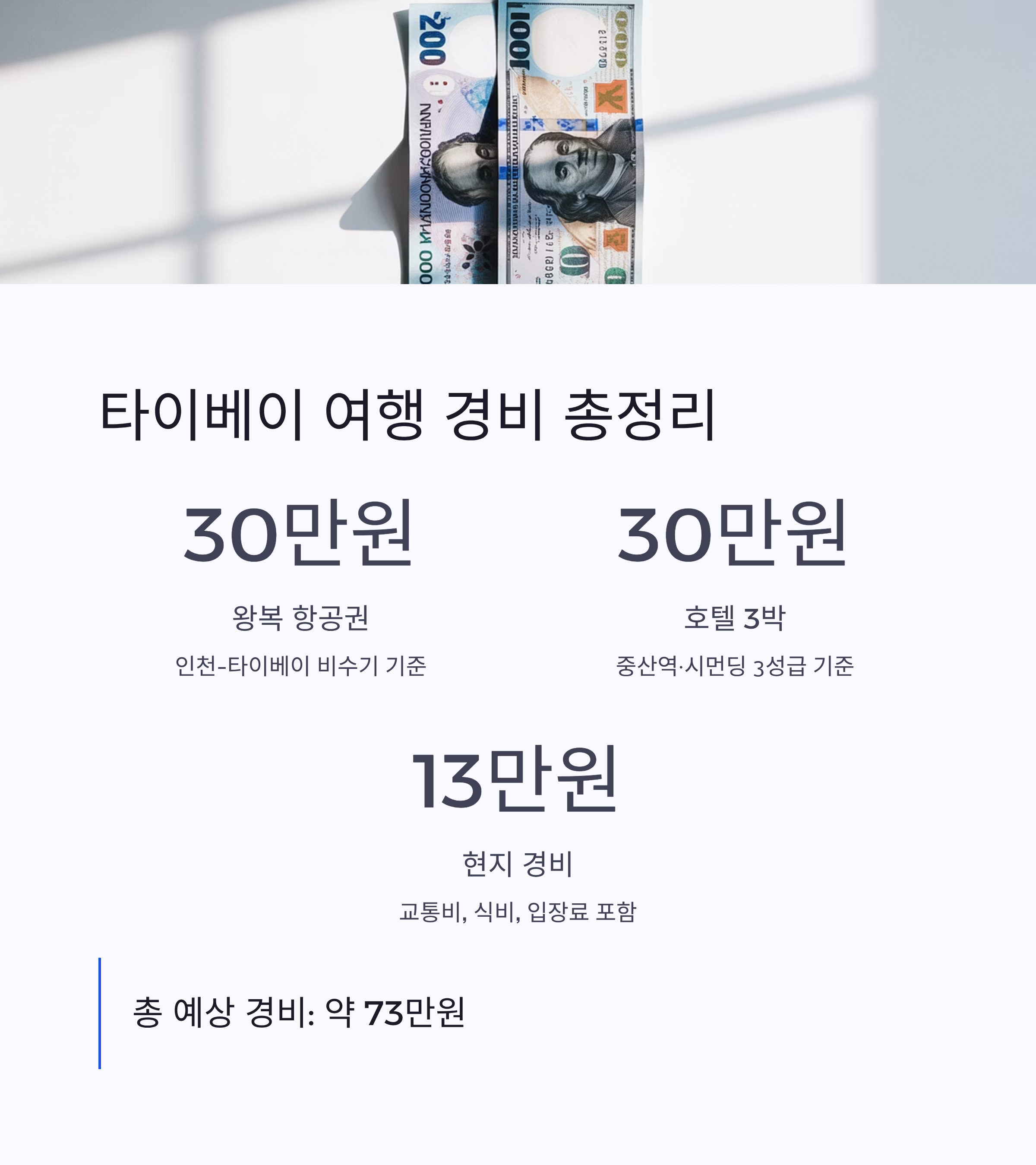 대만 타이베이는 아기자기한 골목부터 야경 명소, 그리고 먹거리가 넘쳐나는 도시입니다. 특히 3박 4일 일정은 타이베이와 근교 지역까지 여유롭게 둘러볼 수 있어 가족여행이나 자유여행 모두에 적합한 일정인데요. 이번 글에서는 항공권과 호텔을 포함한 전체 경비, 여행 중 꼭 가봐야 할 명소, 현지 물가 정보와 추천 맛집까지 실속 있게 알려드릴게요.