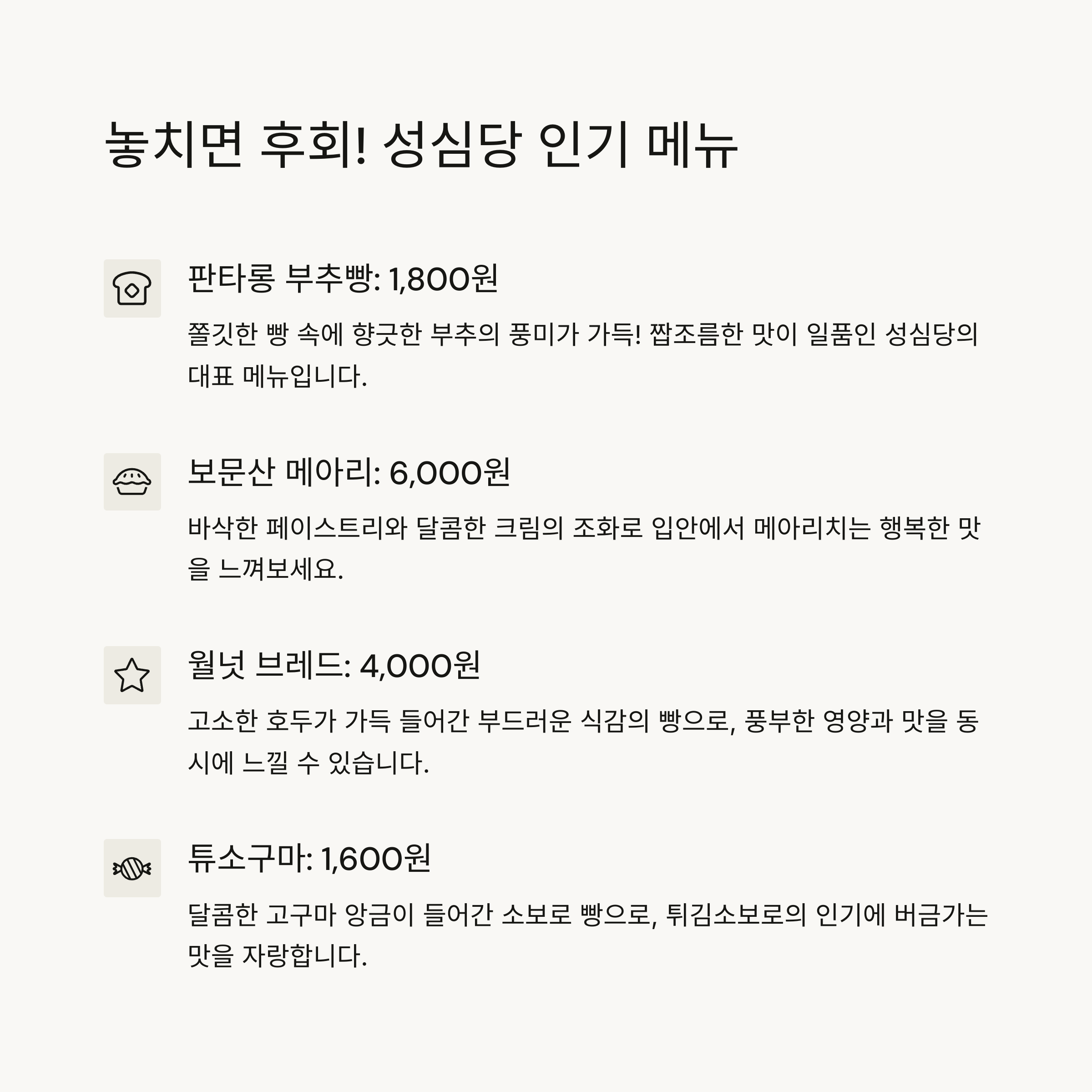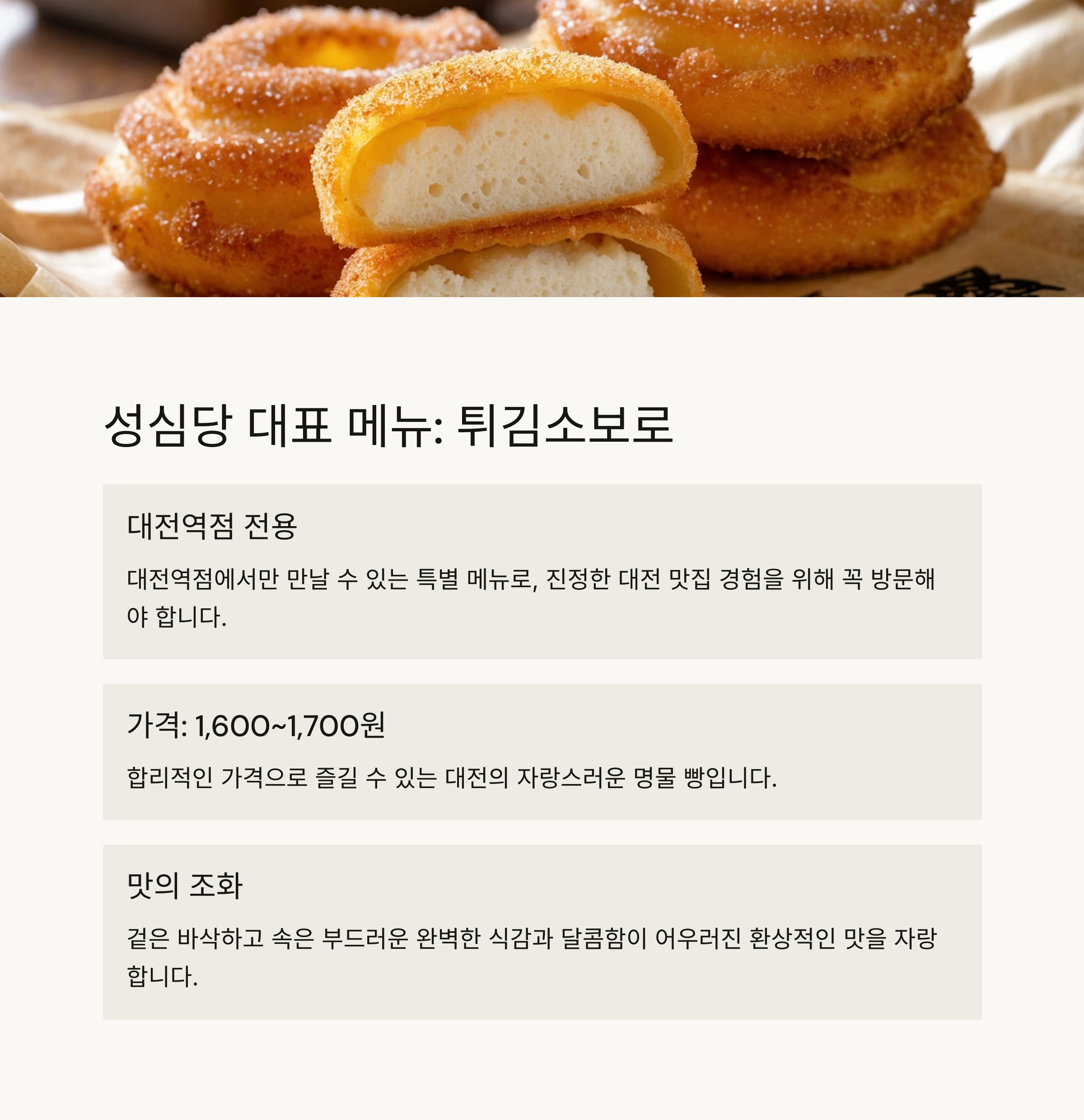 메뉴 선택 팁: 성심당의 베스트셀러는 튀김소보로와 계절 한정 메뉴들입니다. 다양한 디저트와 함께 즐겨보세요.