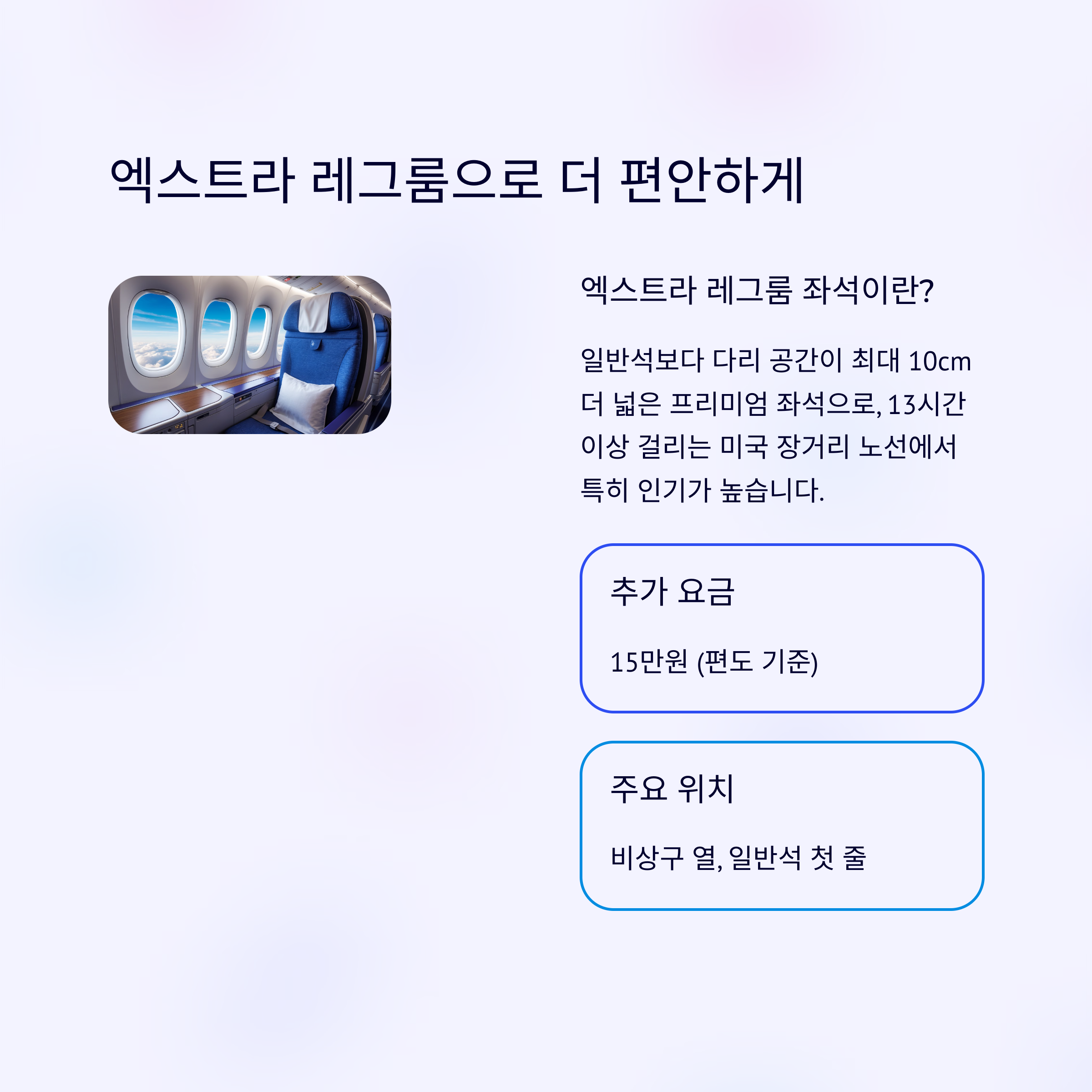 특히 엑스트라 레그룸 좌석은 비즈니스석에 버금가는 다리 공간을 제공해, 장거리 비행을 더 편안하게 할 수 있습니다.