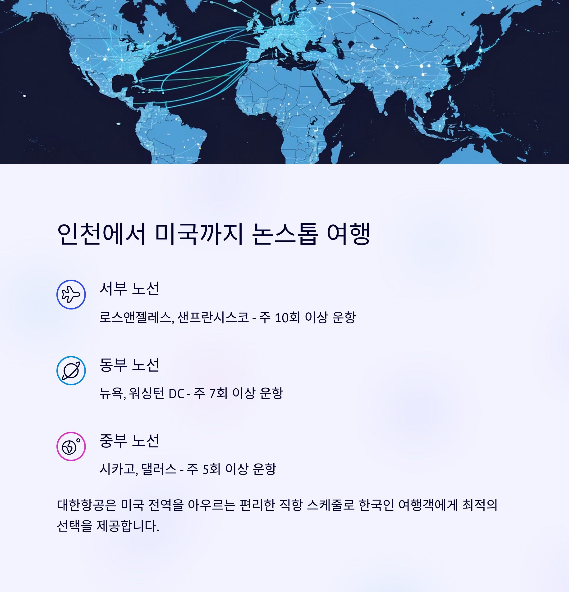 대한항공 미국 노선은 서울(인천)에서 주요 도시로 향하는 직항 서비스로 잘 알려져 있습니다.