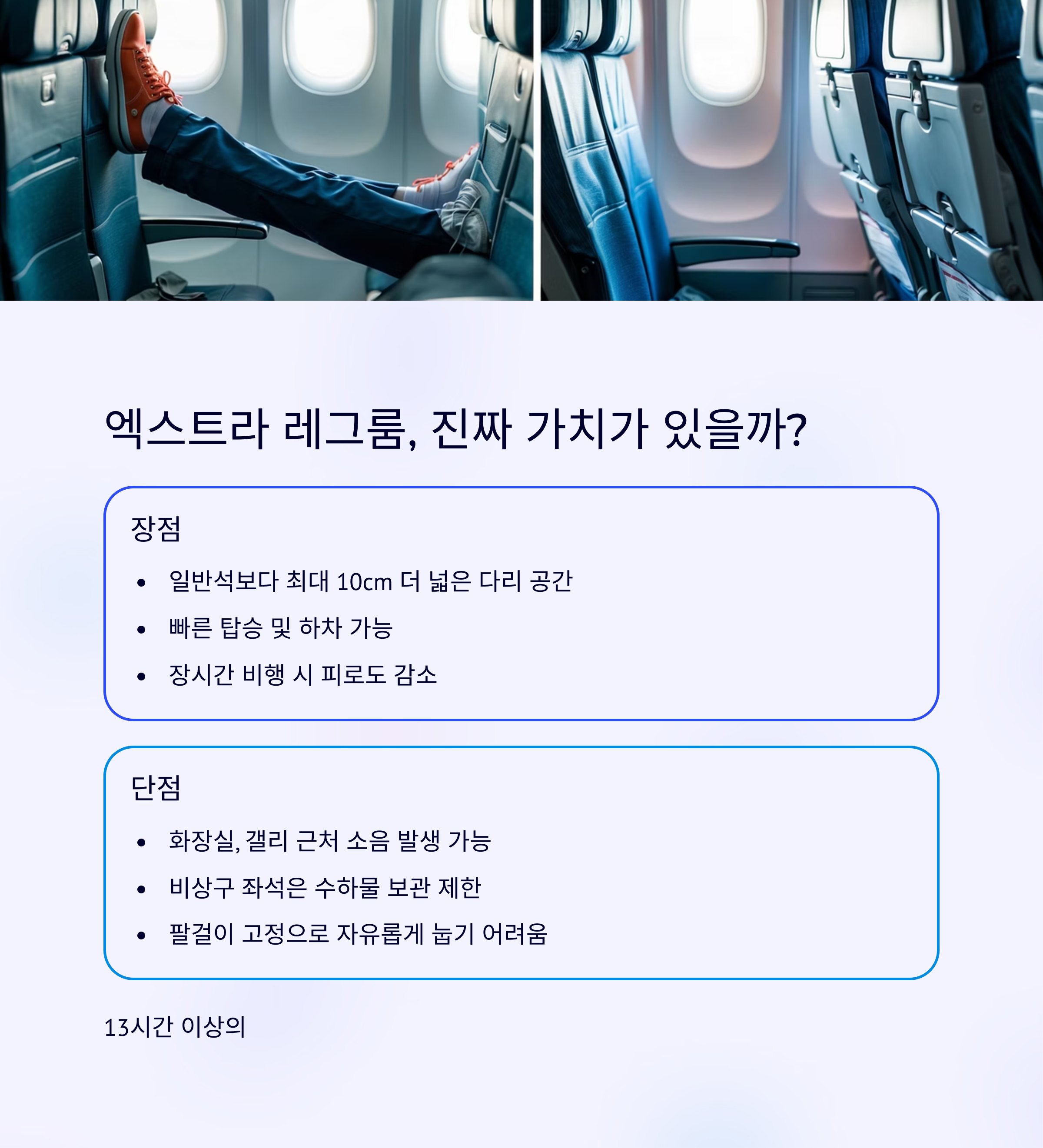 | 엑스트라 레그룸 좌석은 장시간 비행에 특히 적합합니다. 다리가 긴 승객에게 넉넉한 공간을 제공해 편안함을 극대화합니다. 비즈니스석은 부담스럽지만 더 많은 공간을 원하는 승객에게 추천됩니다. 승하차가 빠른 위치를 선호하는 여행객에게 큰 보탬이 됩니다. 장시간 작업이나 휴식을 계획 중인 승객에게 유용합니다. |
