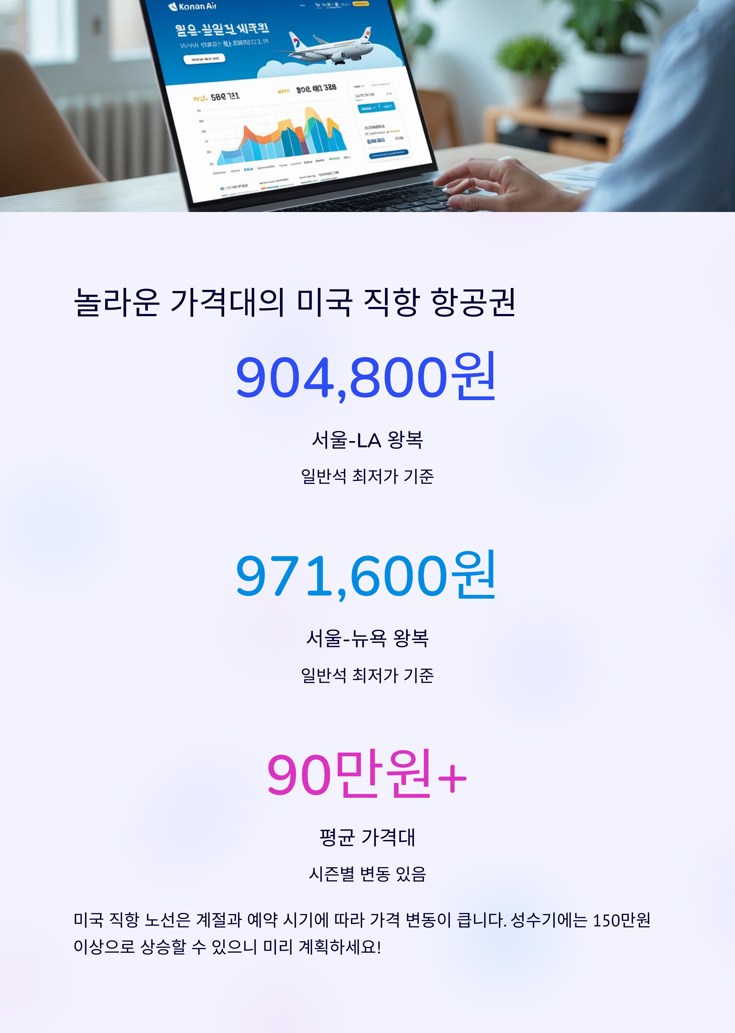 서울-로스앤젤레스 최저가는 90만 원 대부터 시작하며, 서울-뉴욕 노선 역시 약 97만 원에 예약 가능합니다.