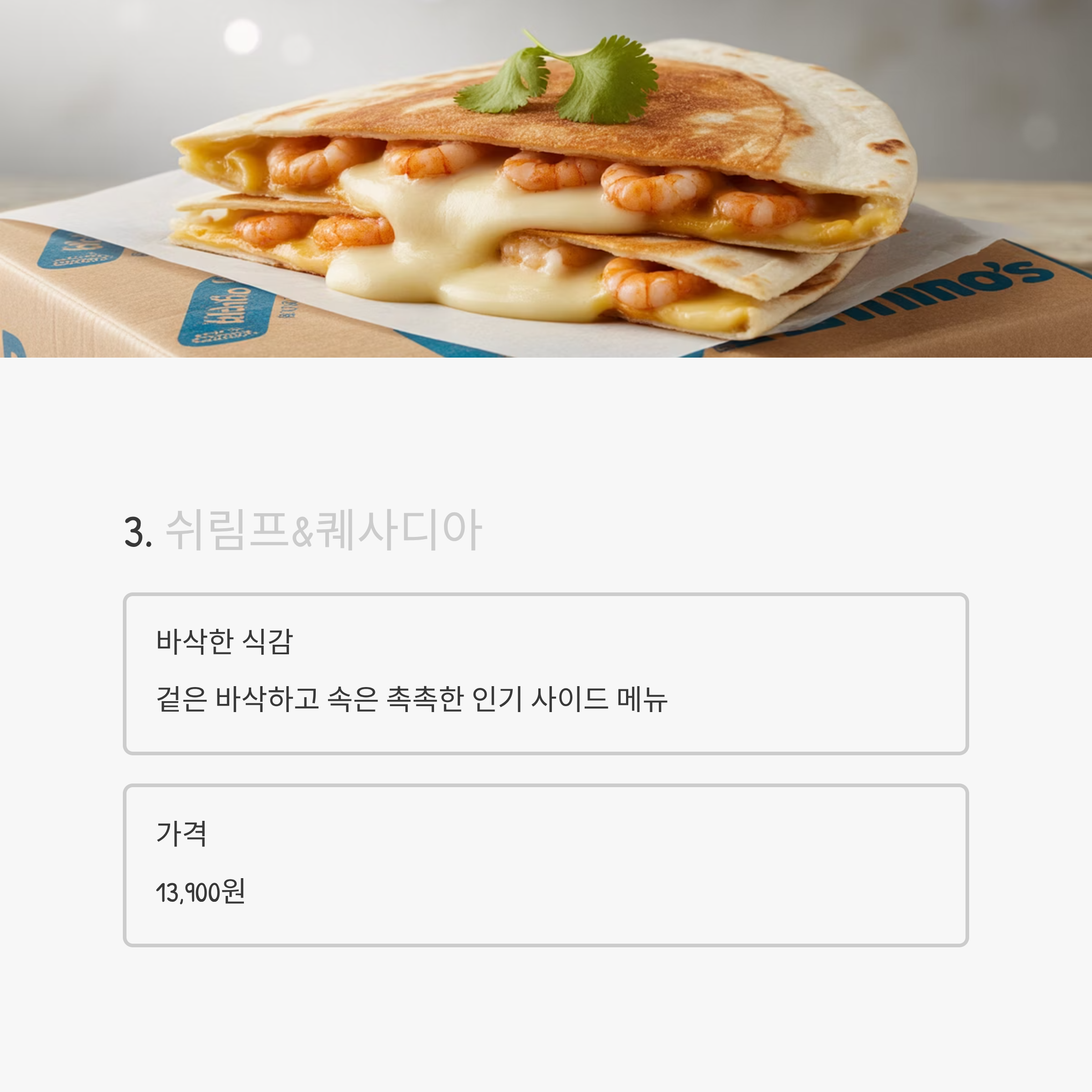| 쉬림프 퀘사디아 | 사이드로 딱 좋은 바삭한 간식 메뉴 | 약 13,900원 |