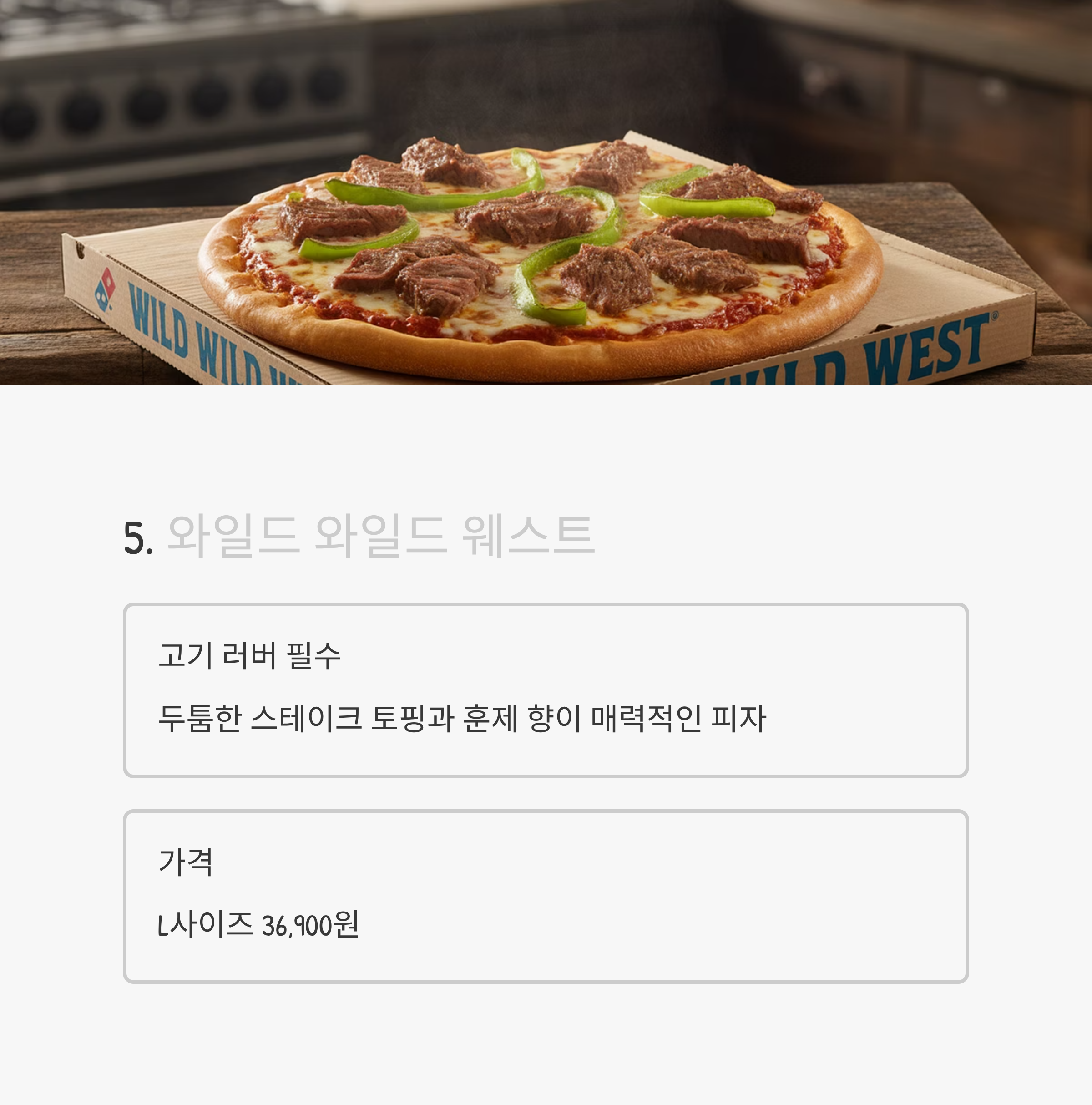 | 와일드와일드웨스트스테이크 | 훈제 고기 향 가득, 스테이크 피자 | 약 36,900원 |