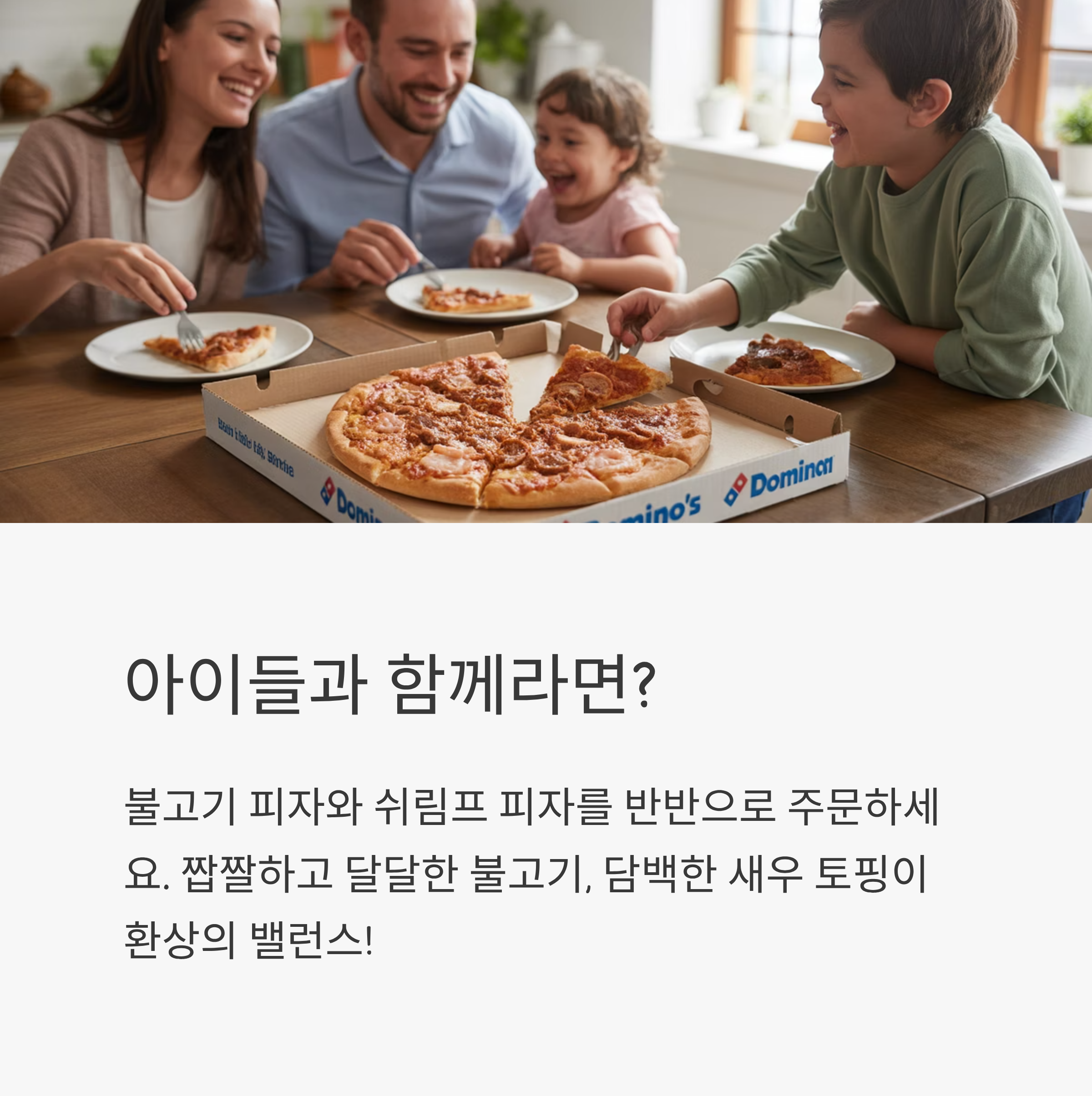 도미노의 불고기 피자와 쉬림프 피자를 반반으로 주문하면 어린이부터 어른까지 모두 만족할 수 있는 조합이 완성됩니다.