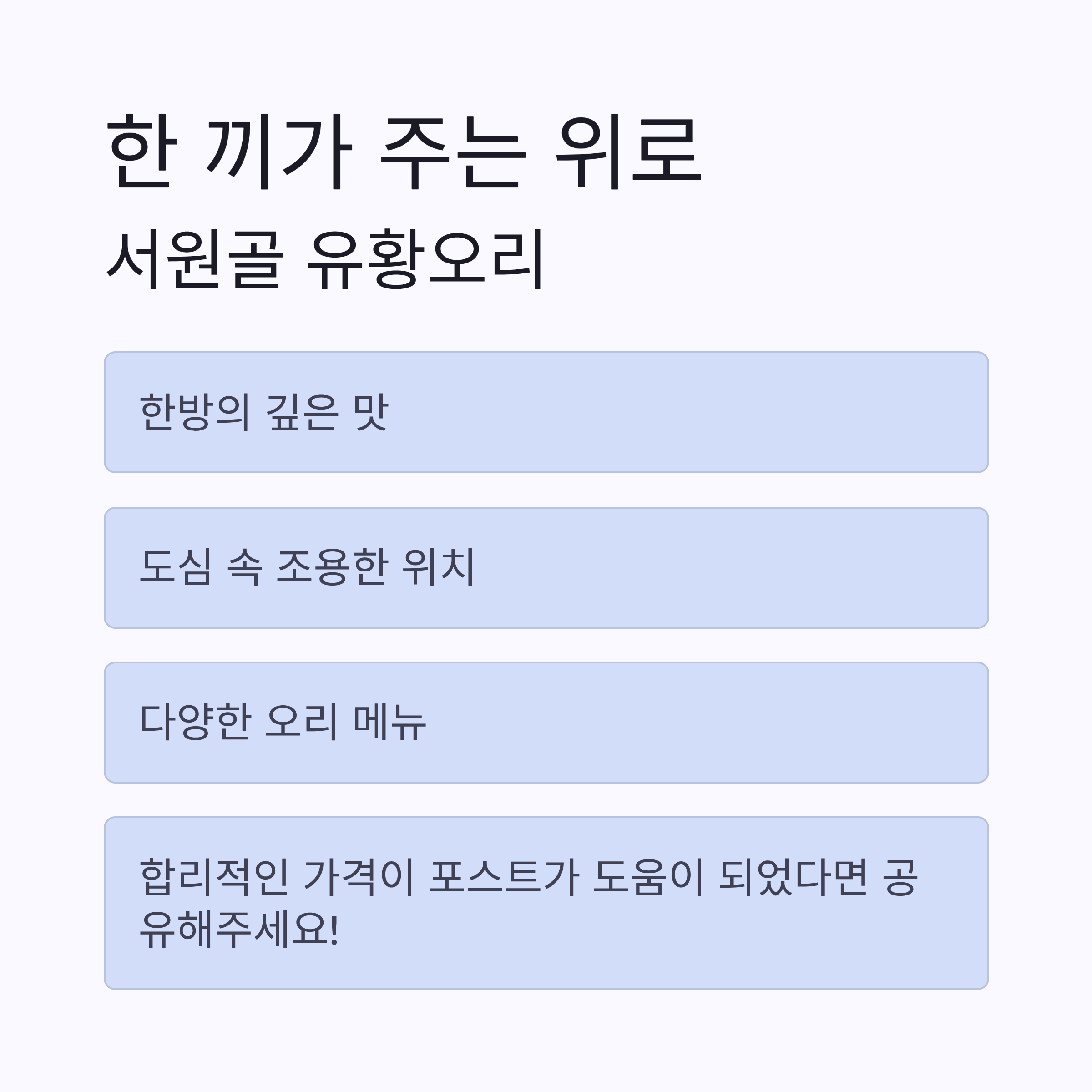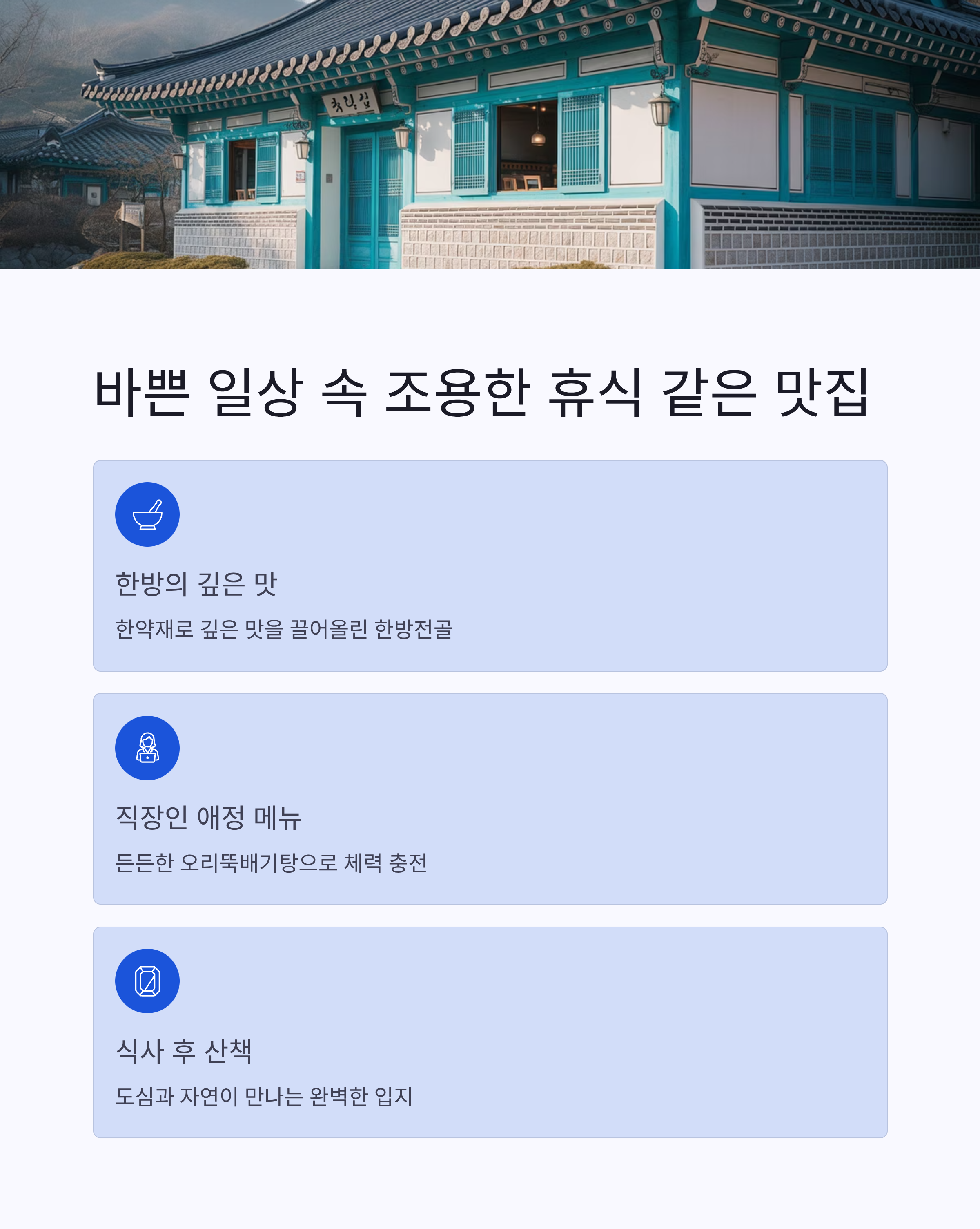 한방의 깊은 맛, 도심 속 조용한 위치, 다양한 오리 메뉴와 합리적인 가격.