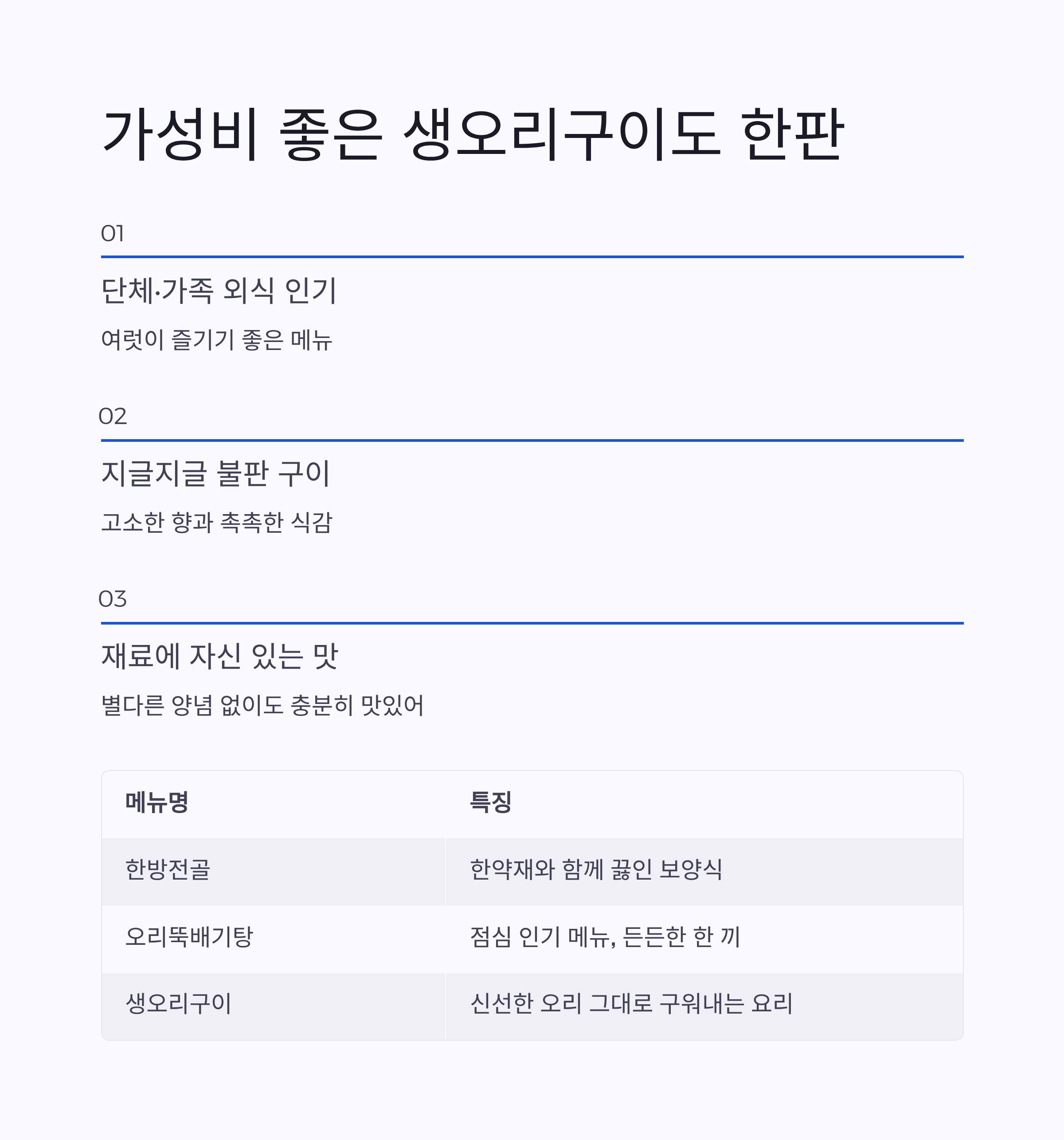 단체 방문이나 가족 외식으로도 인기 많은 생오리구이.
