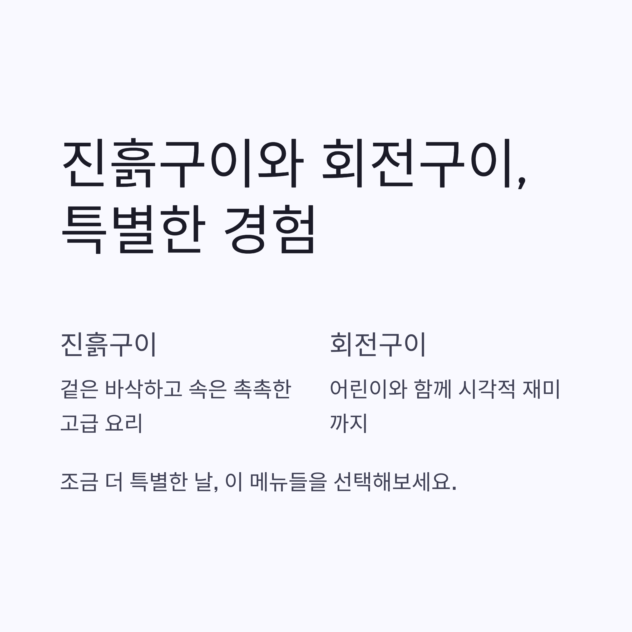 불판에 지글지글 구워 한입 먹는 순간, 고소한 향과 촉촉한 식감이 입안 가득 퍼집니다.