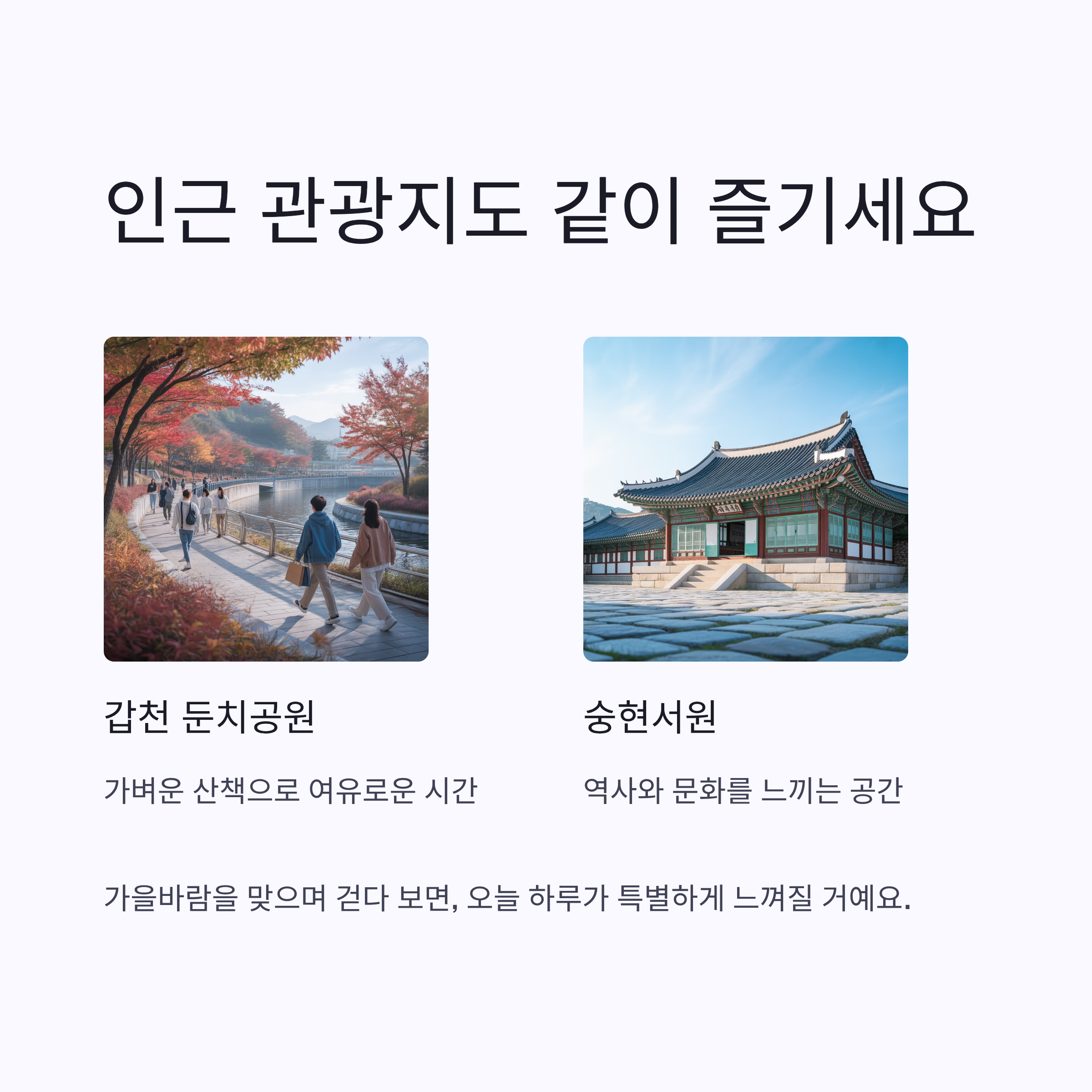 가을바람을 맞으며 걷다 보면, 오늘 하루가 특별하게 느껴질 거예요.
