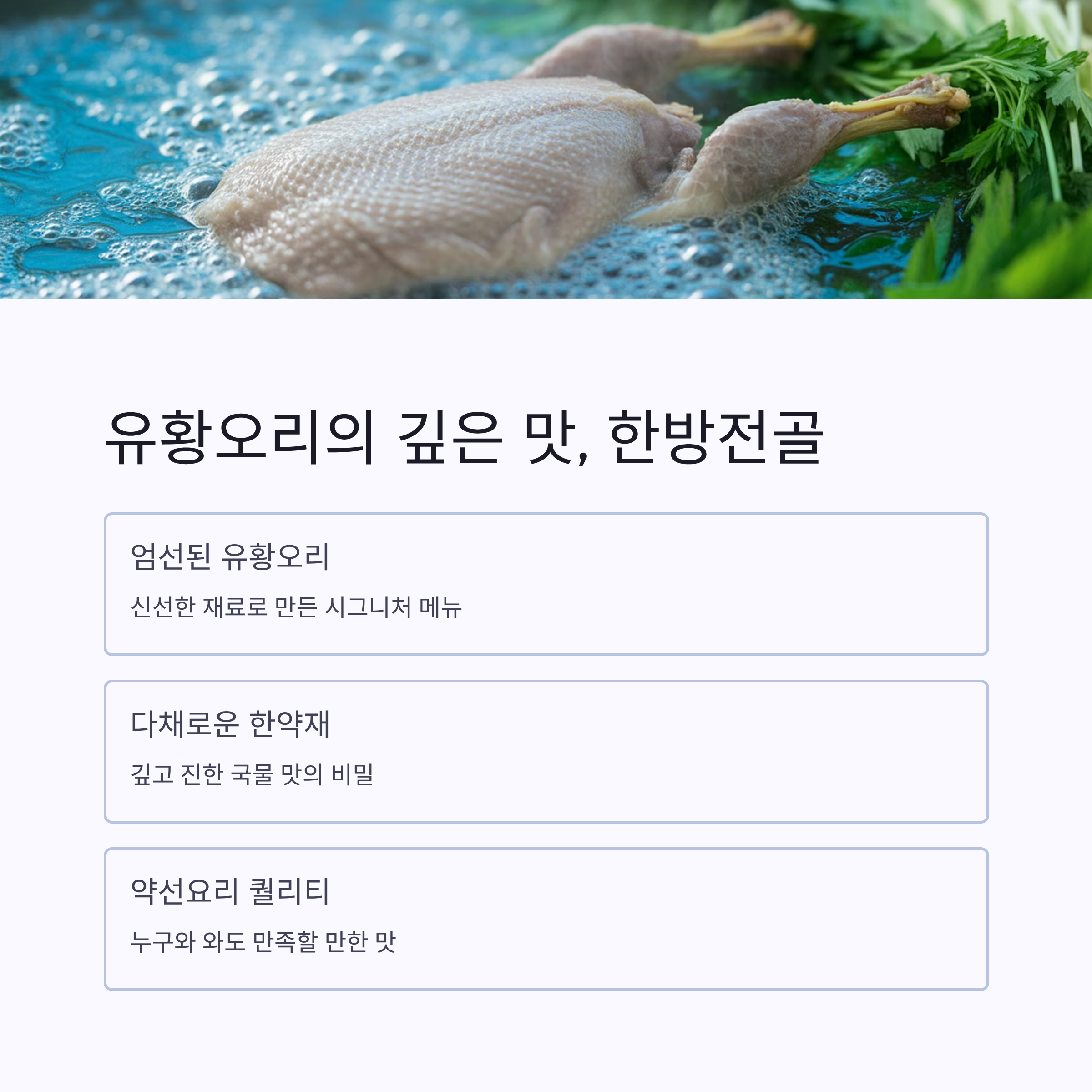 한방의 깊은 맛, 도심 속 조용한 위치, 다양한 오리 메뉴와 합리적인 가격.