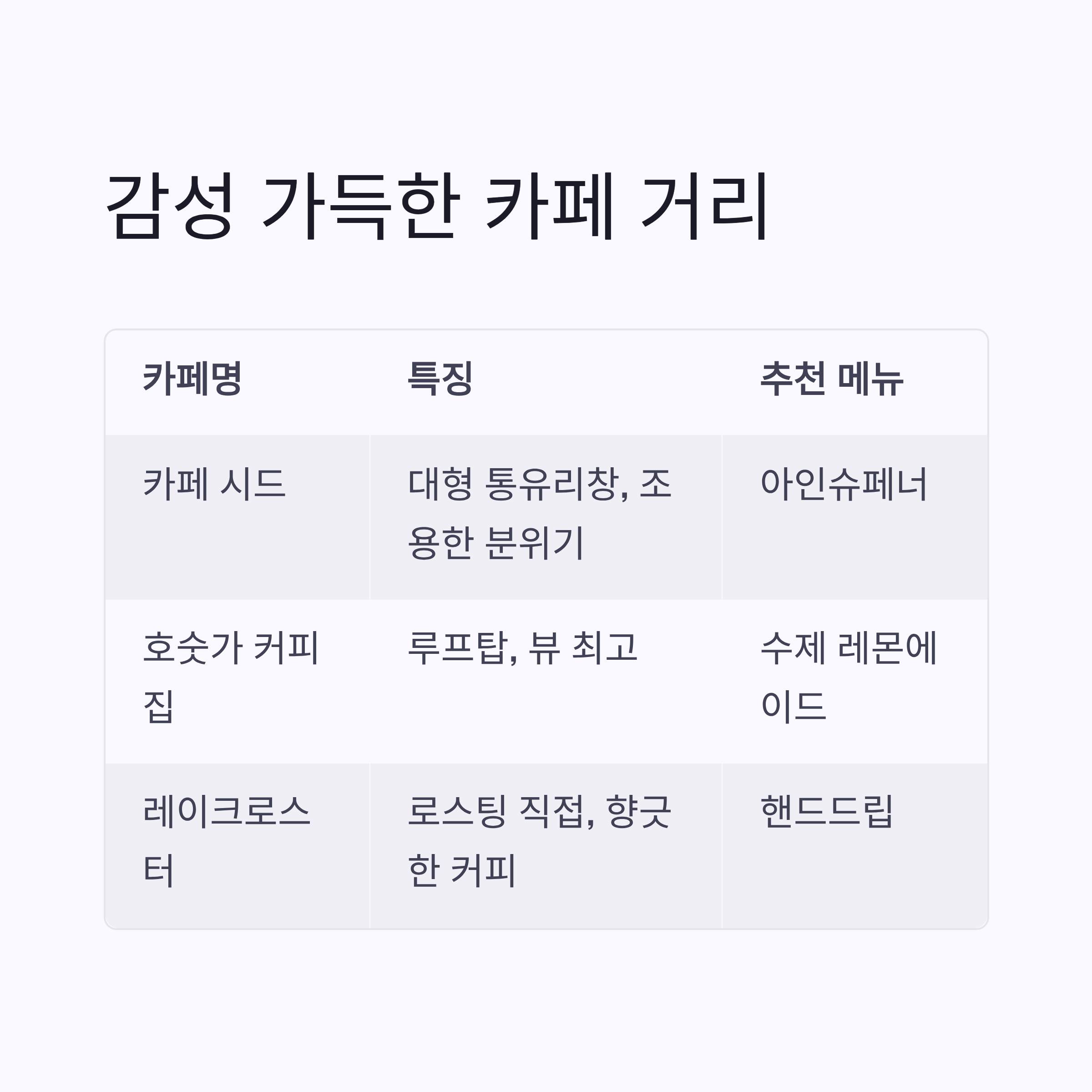 | 호숫가 커피집 | 루프탑 있음, 뷰 최고 | 수제 레몬에이드 |