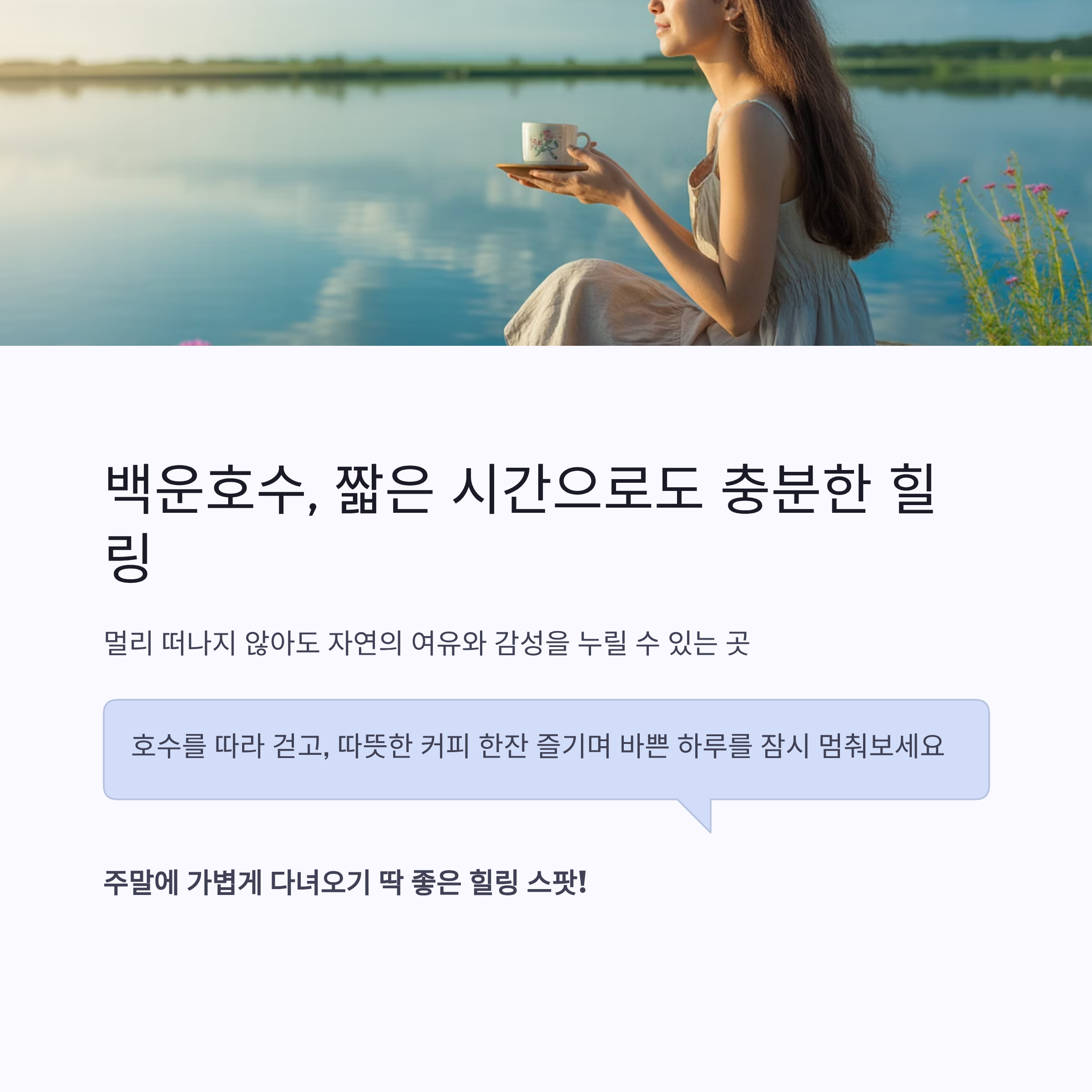의왕시에 위치한 백운호수는 수도권에서 가볍게 드라이브하며 다녀오기 좋은 대표적인 호수 명소입니다. 특히 탁 트인 수변 산책로와 더불어 개성 있는 카페 거리, 분위기 좋은 레스토랑들이 모여 있어 가족 나들이부터 연인 데이트까지 다양한 목적의 방문객들에게 인기를 끌고 있는데요. 오늘은 백운호수의 매력을 하나하나 깊이 있게 소개해드릴게요.
