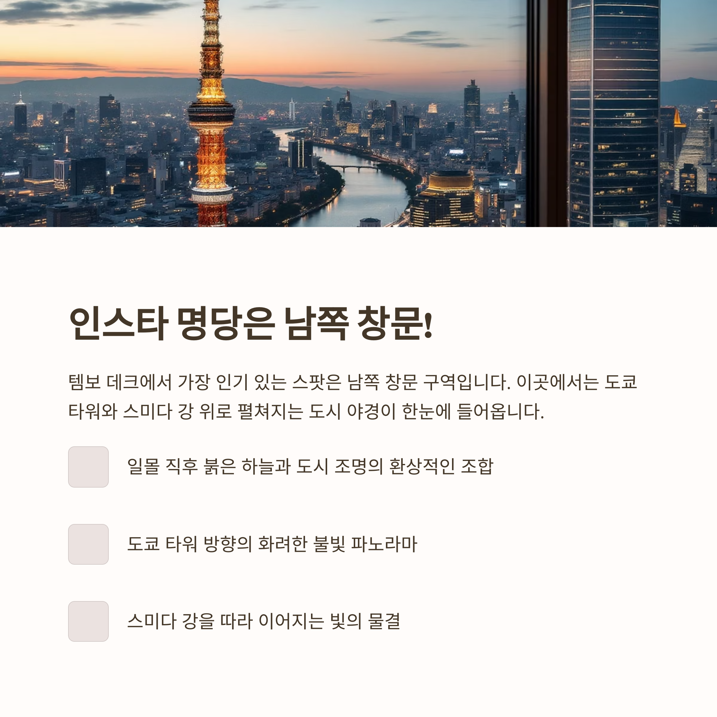 이곳에서는 도쿄 타워 방향의 불빛, 스미다 강 위로 펼쳐지는 도시 야경을 볼 수 있습니다.