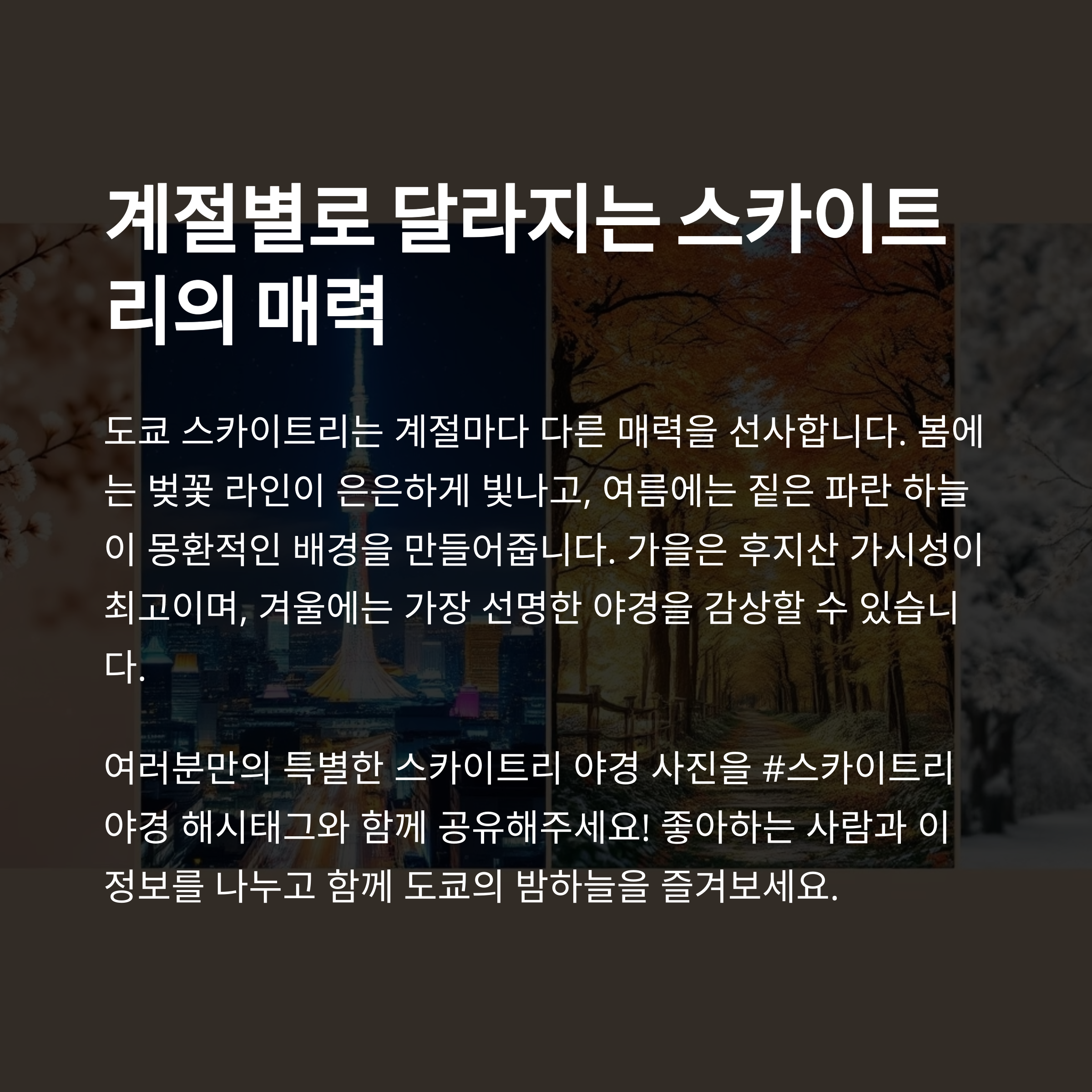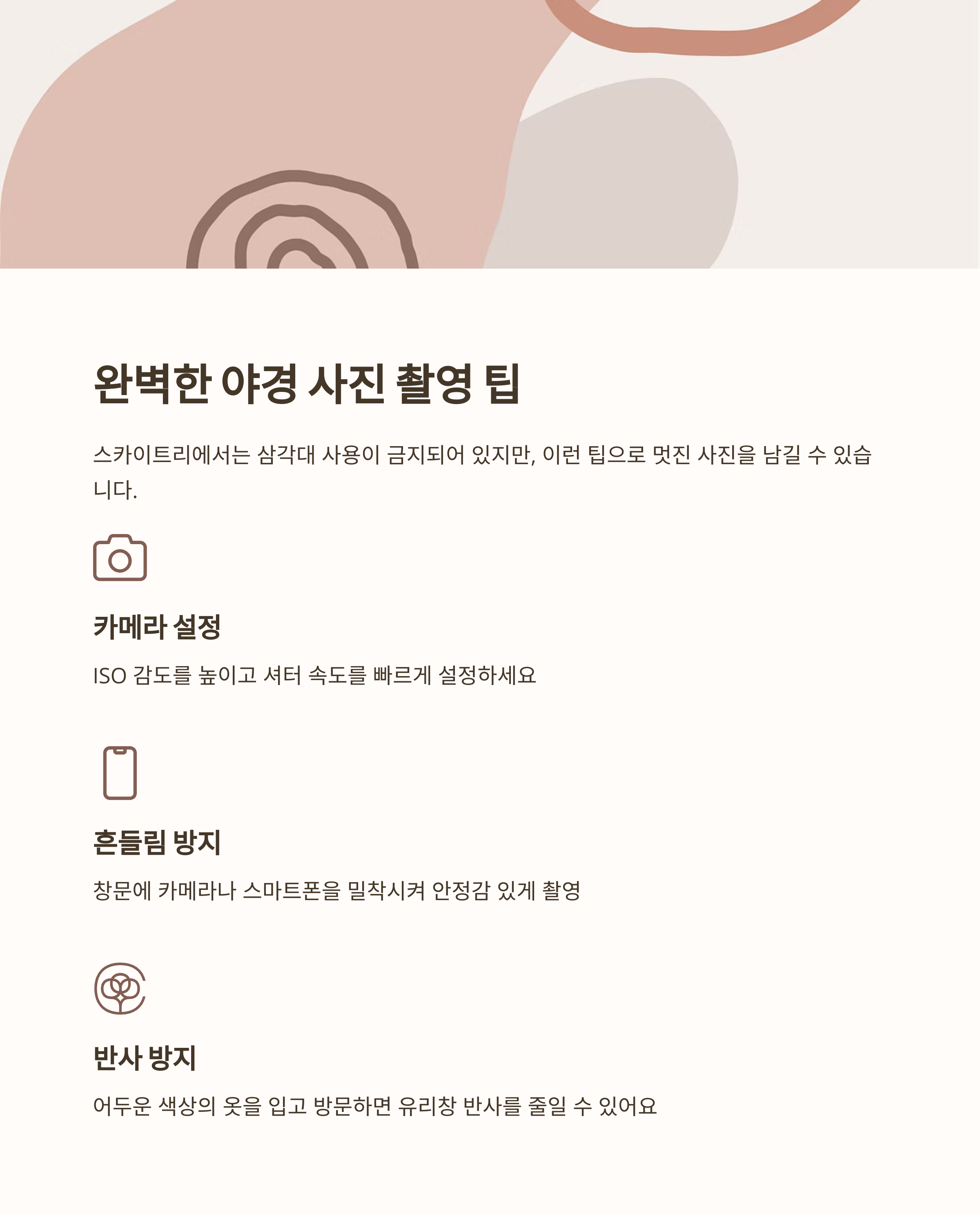 도쿄 스카이트리는 일본에서 가장 높은 타워이자, 도쿄의 야경을 한눈에 담을 수 있는 명소입니다. 특히 전망대에서는 도쿄의 화려한 불빛과 함께 후지산 실루엣까지 조망할 수 있어 낮보다 밤이 더 매력적입니다. 이번 글에서는 스카이트리 전망대에서 야경을 가장 멋지게 감상할 수 있는 포인트들과 꿀팁을 정리해 드립니다.