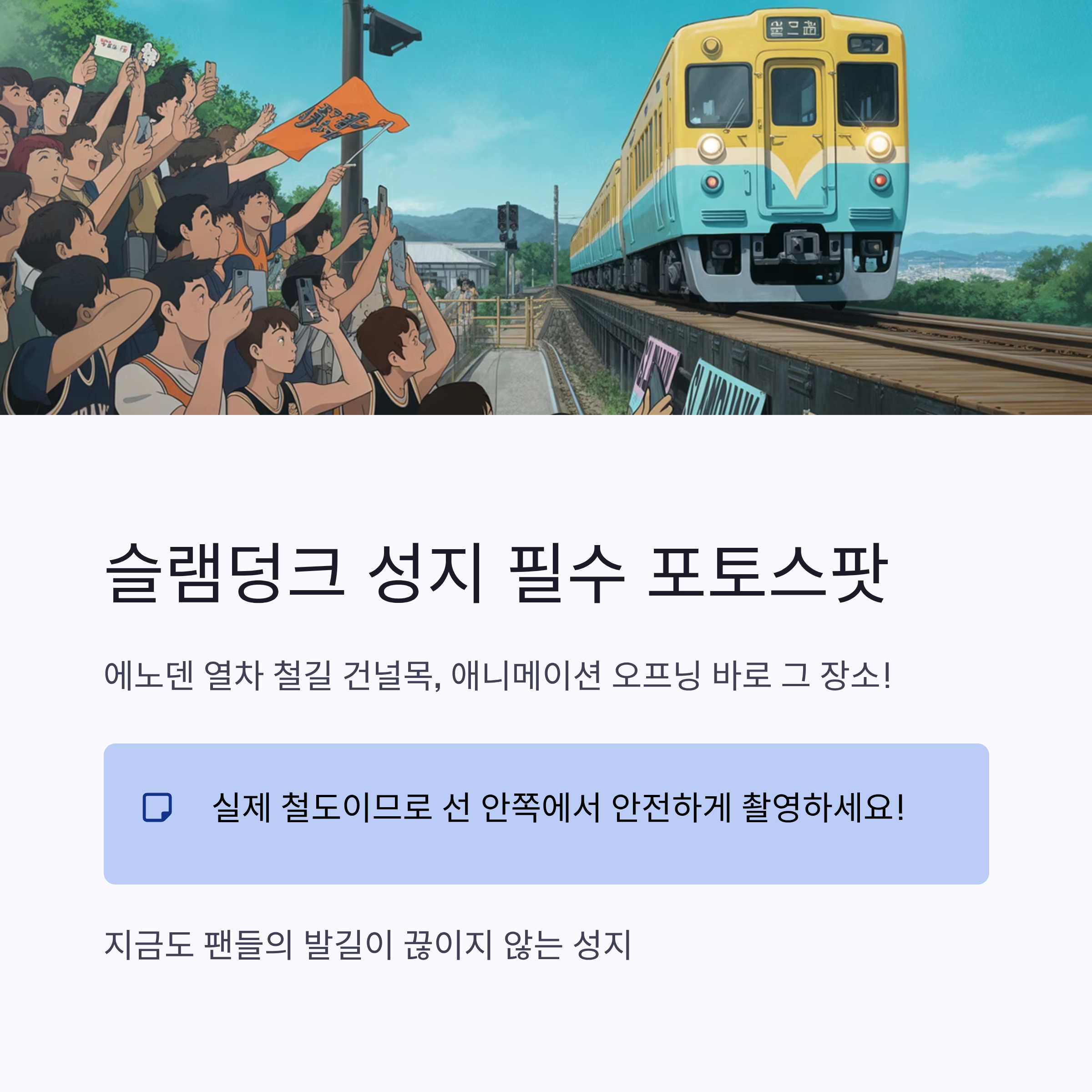 슬램덩크 애니메이션 오프닝 장면에 등장한 바로 그 장소는 지금도 팬들의 발길이 끊이지 않는 포토스폿입니다.