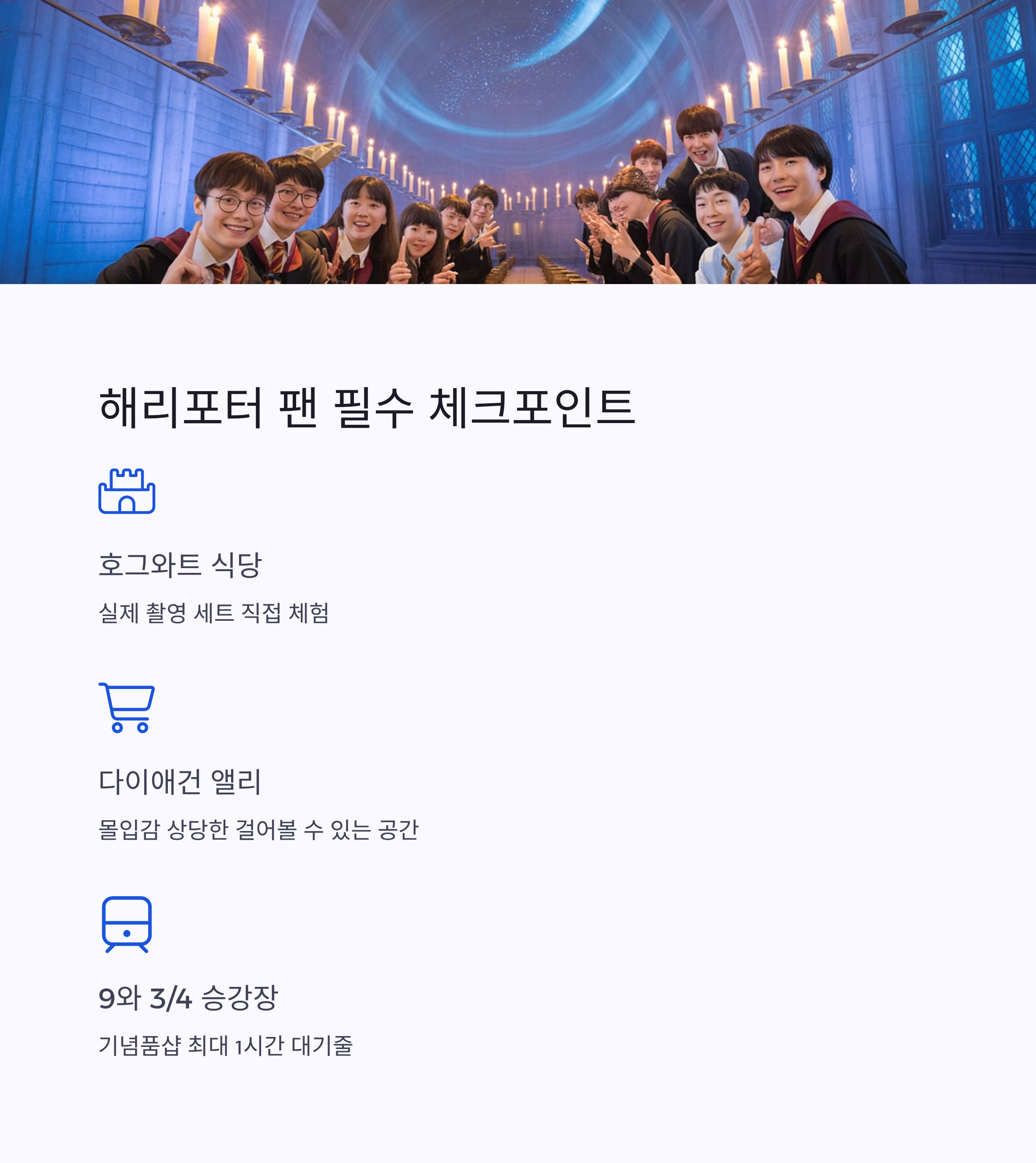호그와트 식당, 다이애건 앨리, 9와 3/4 승강장 등 직접 걸어볼 수 있는 체험형 공간이 많아 몰입감이 상당해요.