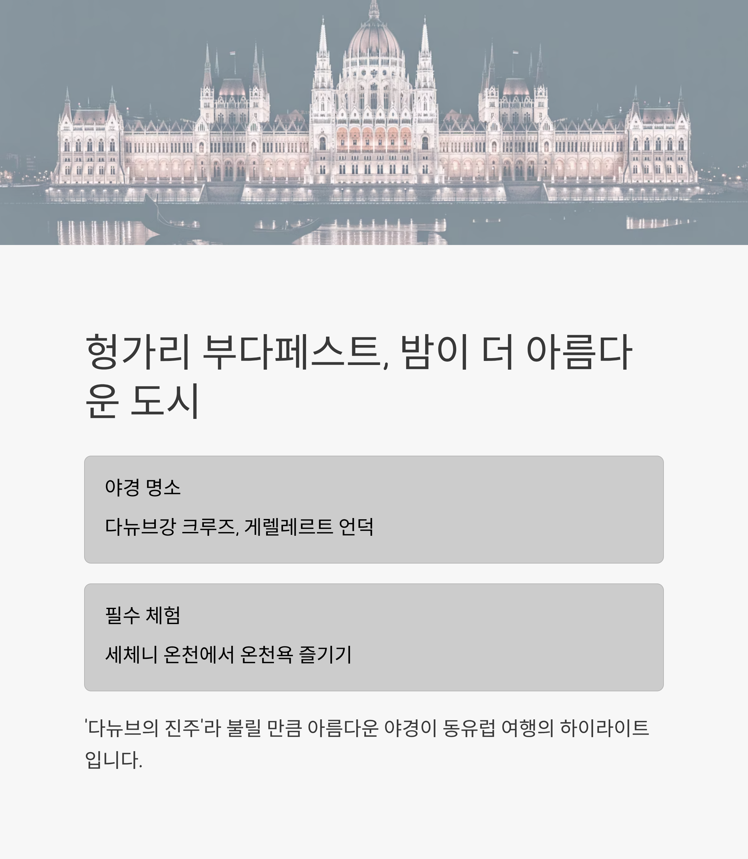 부다페스트는 '다뉴브의 진주'라 불릴 만큼 아름다운 야경으로 유명합니다.