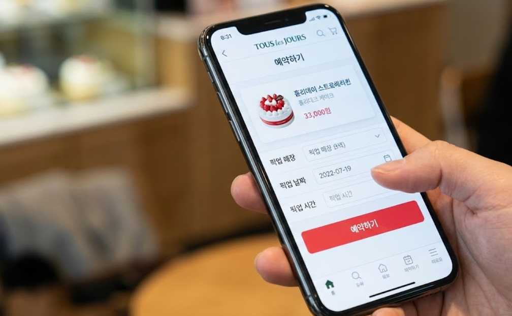 뚜레쥬르 앱에서 케이크를 예약하는 스마트폰 화면 캡처