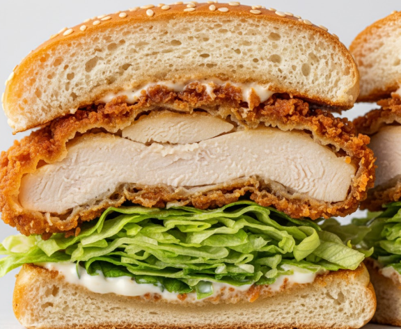 버거의 단면을 잘라 육즙이 흐르는 닭다리살 패티와 신선한 야채