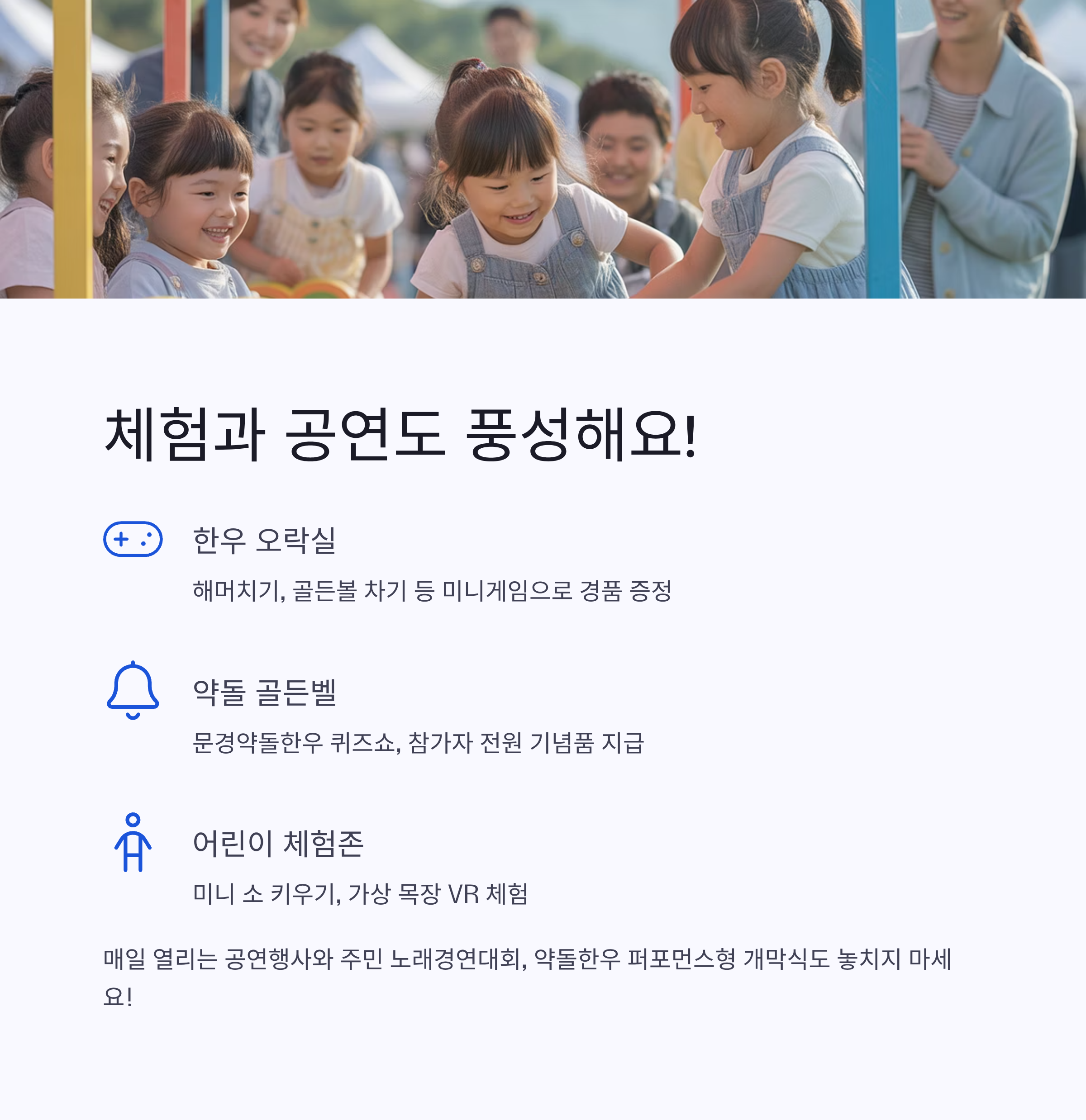 | 어린이 체험존 | 미니 소 키우기 체험, 가상 목장 VR 체험 등 |