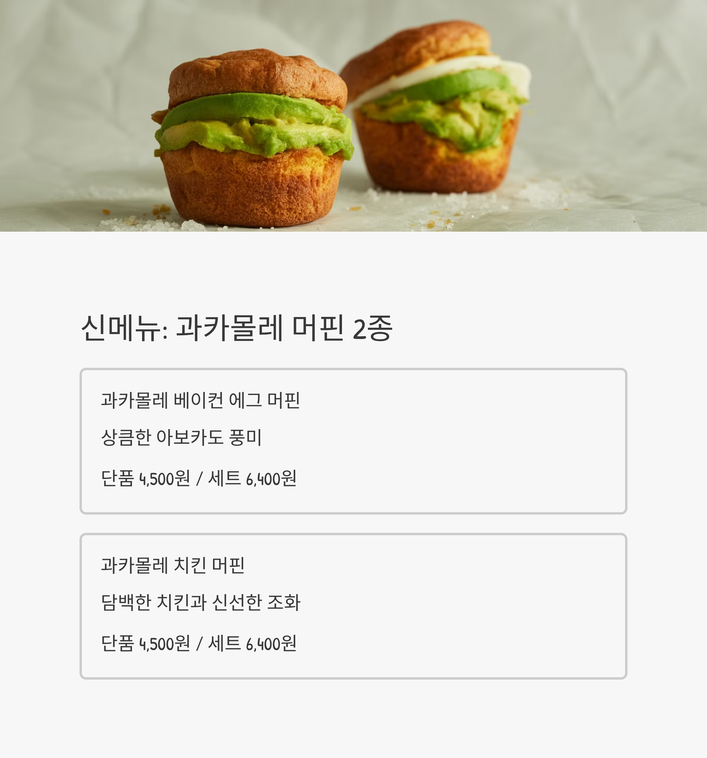 | 과카몰레 치킨 머핀 | 4,500원 | 6,400원 |