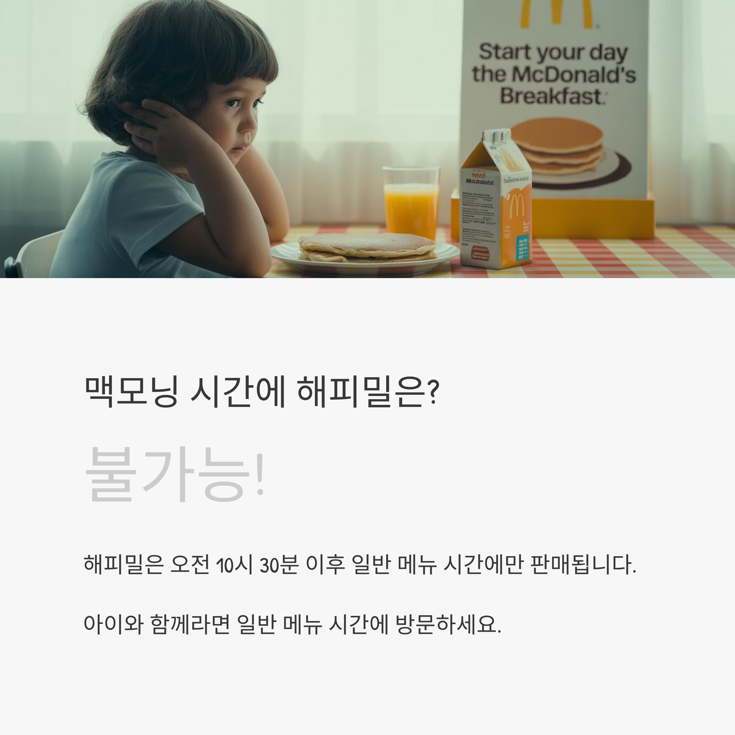 아쉽지만 해피밀은 맥모닝 시간에는 판매하지 않아요.