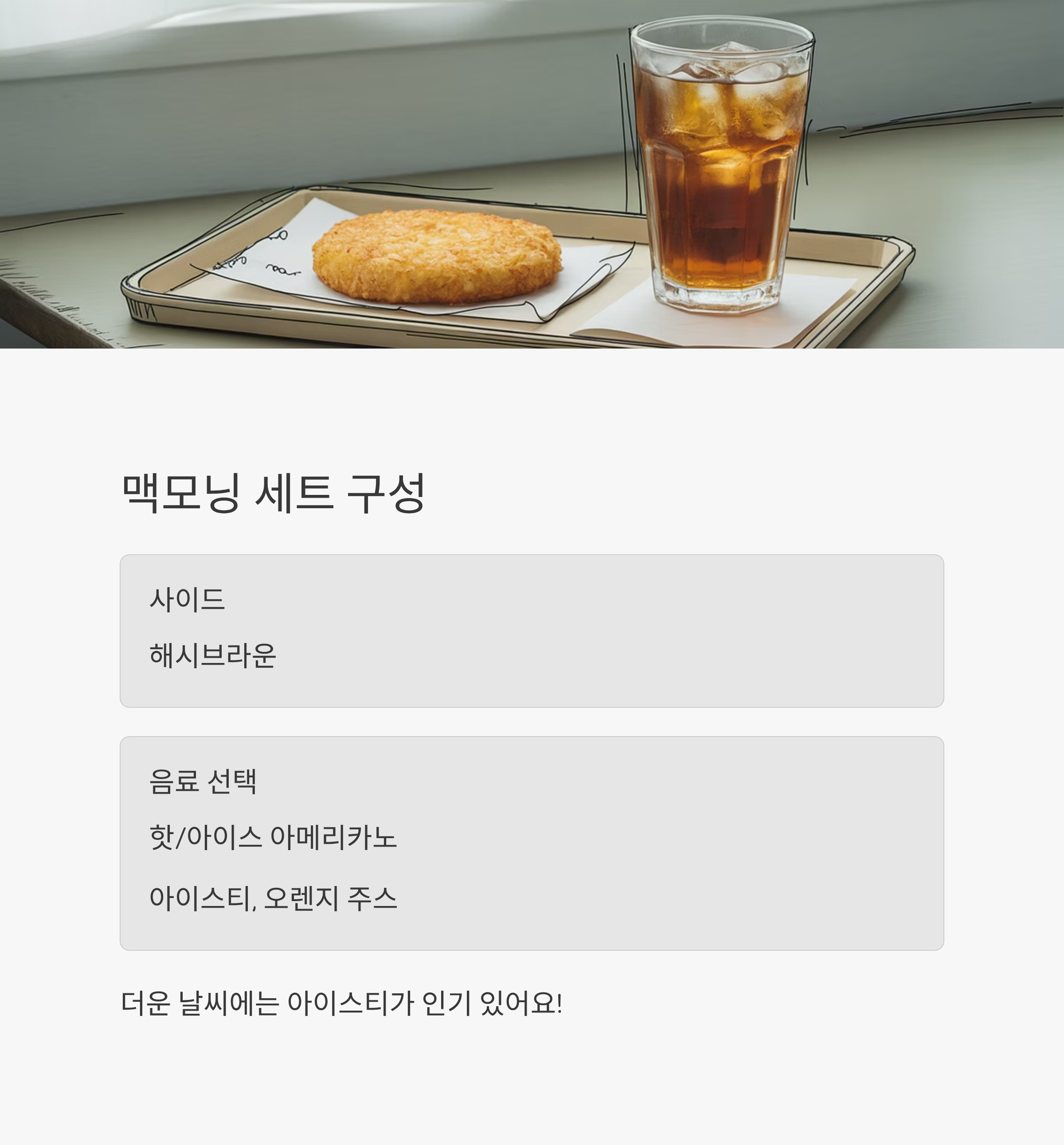 음료는 따뜻한 아메리카노, 오렌지 주스, 아이스티 등으로 변경이 가능해요.