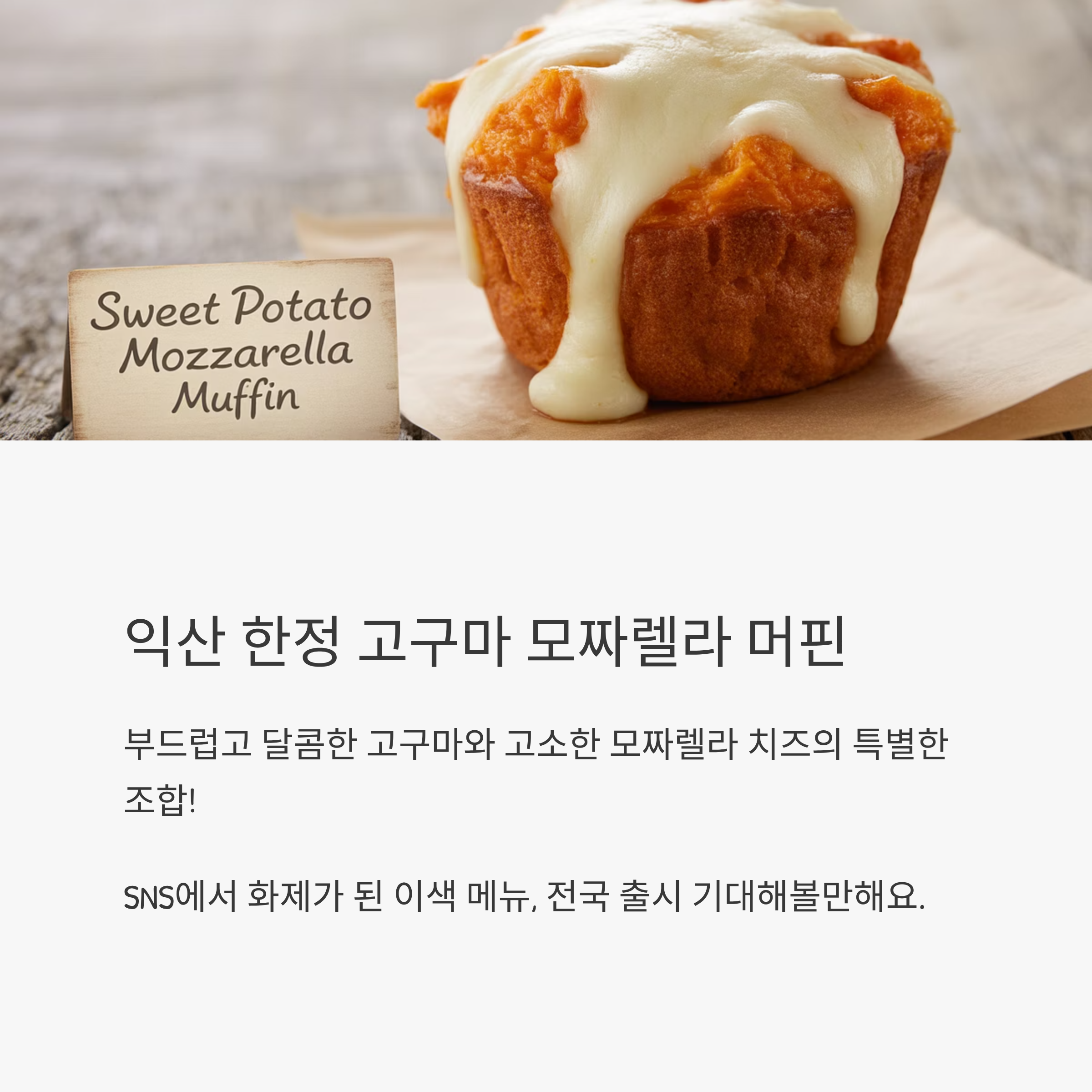 익산 지역 한정으로 출시된 **‘고구마 모차렐라 머핀’**은 부드럽고 달콤한 고구마와 고소한 모차렐라 치즈의 조합이 특징이에요.