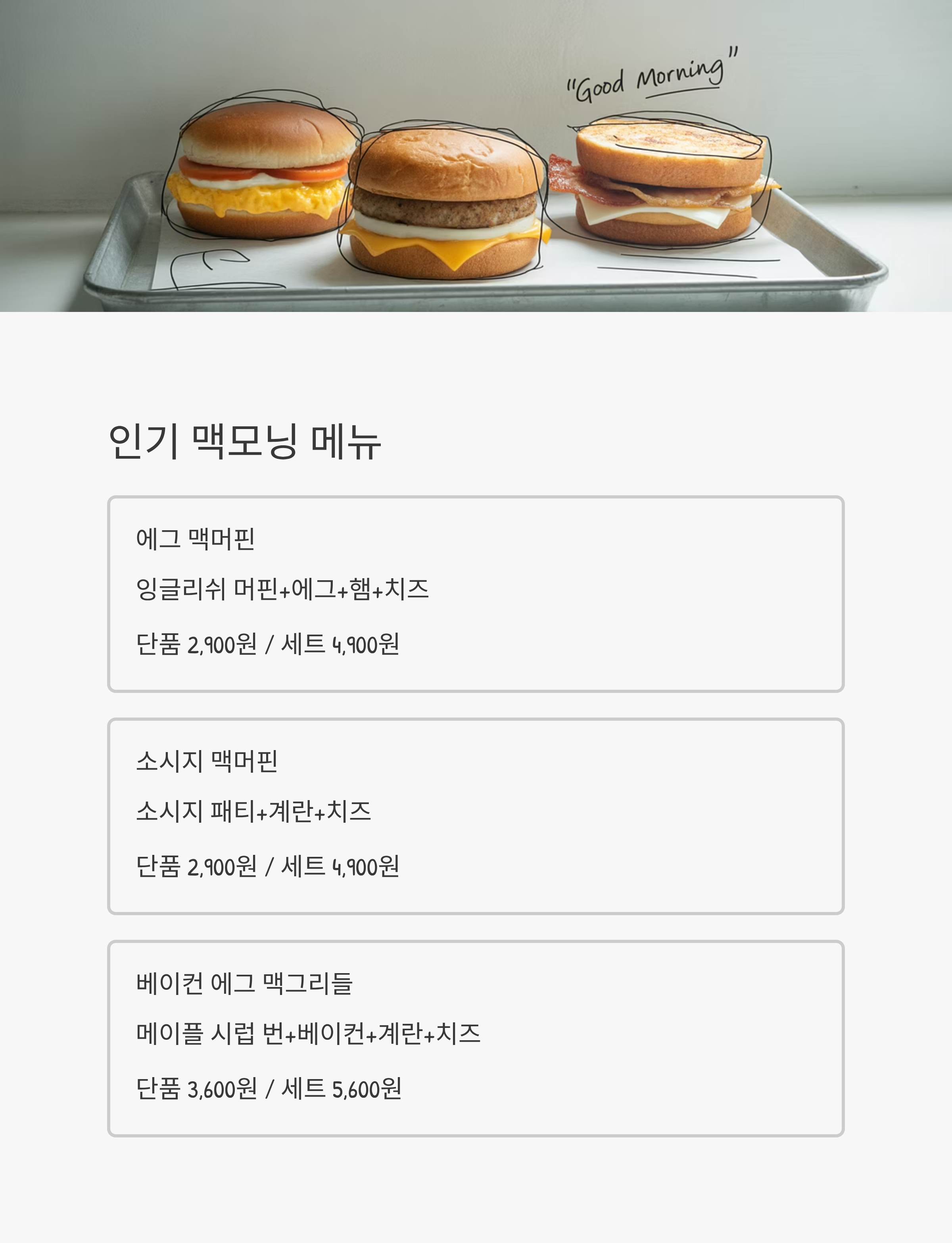 | 소시지 맥머핀 | 소시지 패티 + 계란 + 치즈 | 2,900원 | 4,900원 |