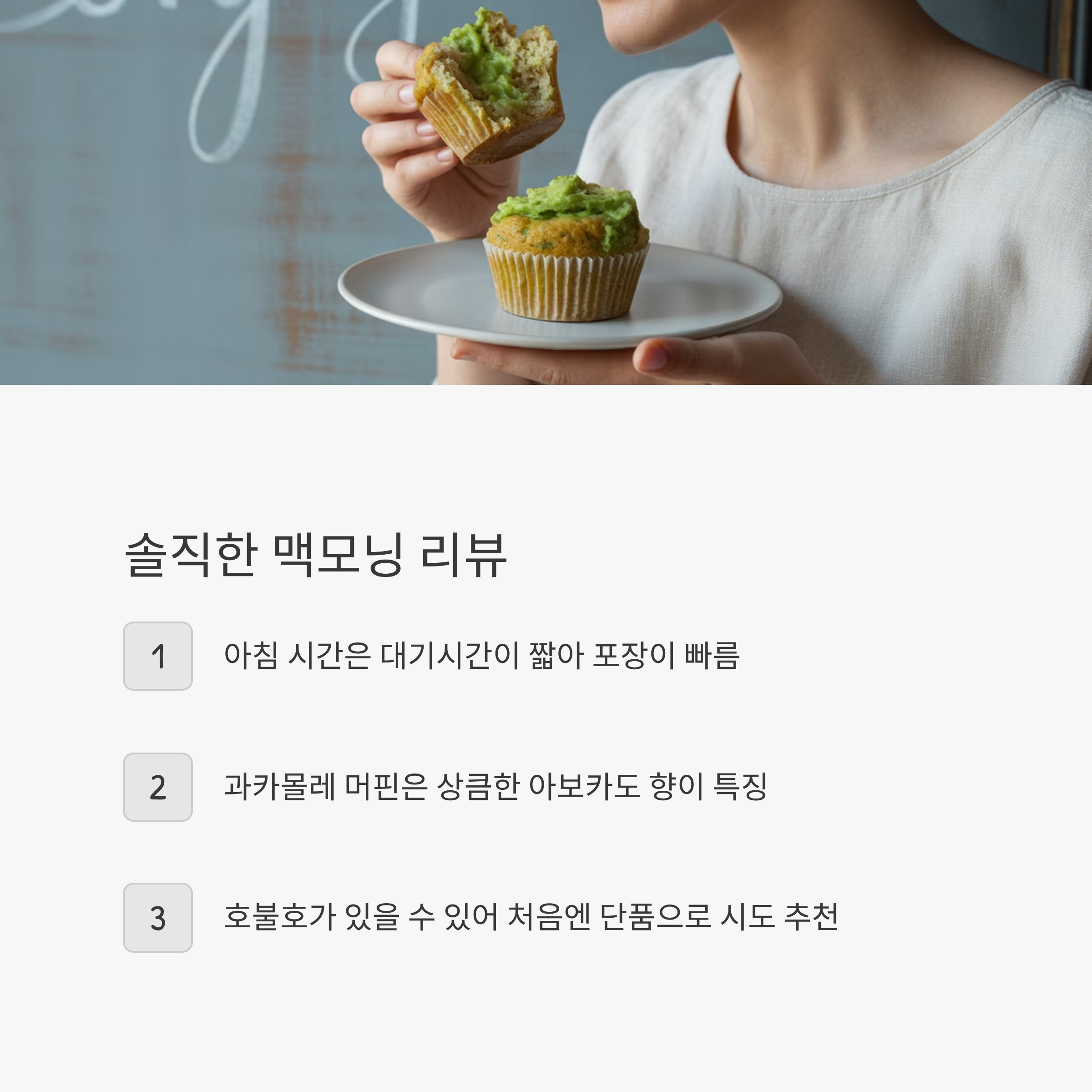 과카몰레 머핀은 처음 한입 물었을 때 신선한 아보카도 향이 확 퍼지며 꽤 상큼합니다.