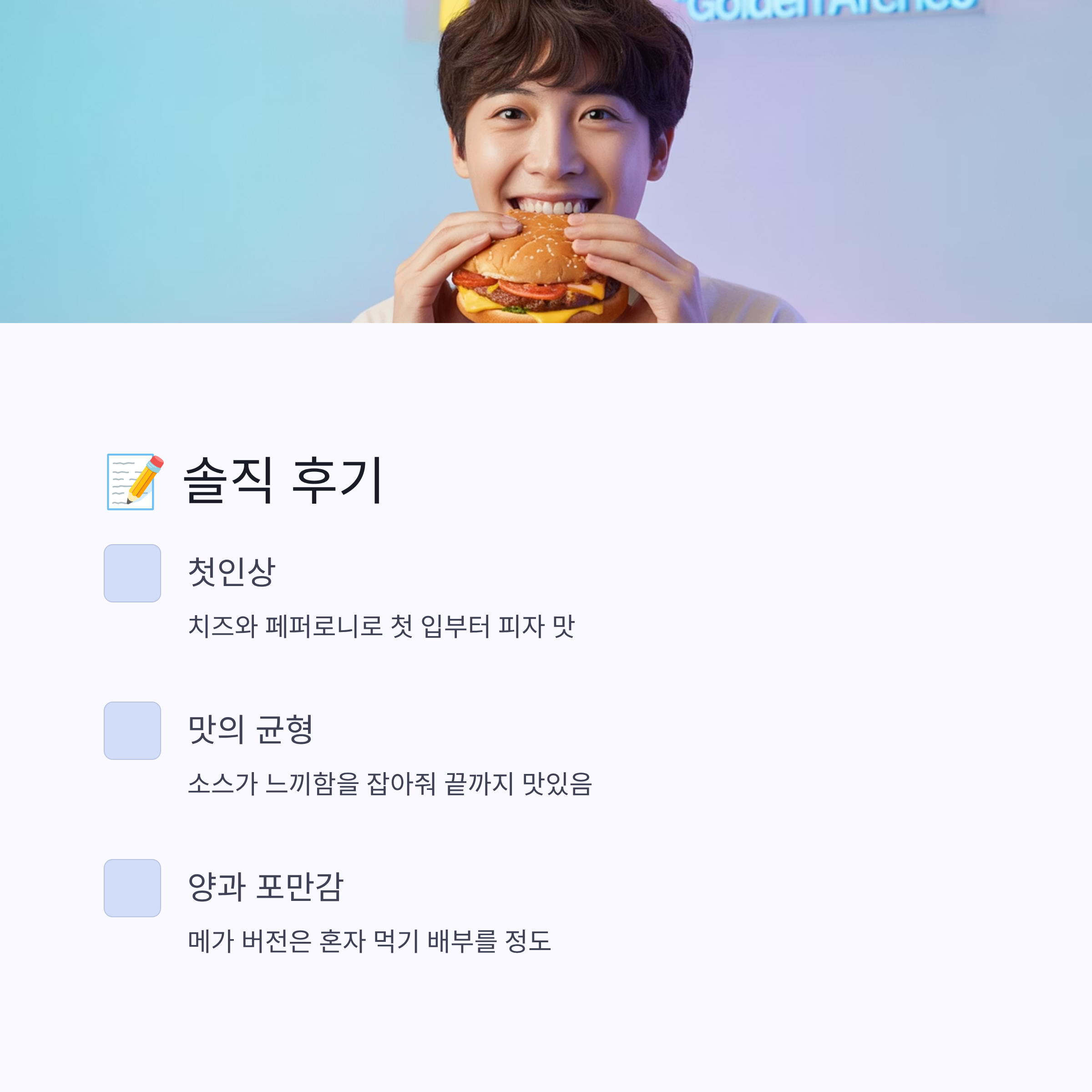 다만, 피자와 버거가 합쳐진 만큼 호불호는 있을 수 있어요. 피자 특유의 짭짤한 맛을 좋아한다면 만족도가 매우 높을 것 같네요.
