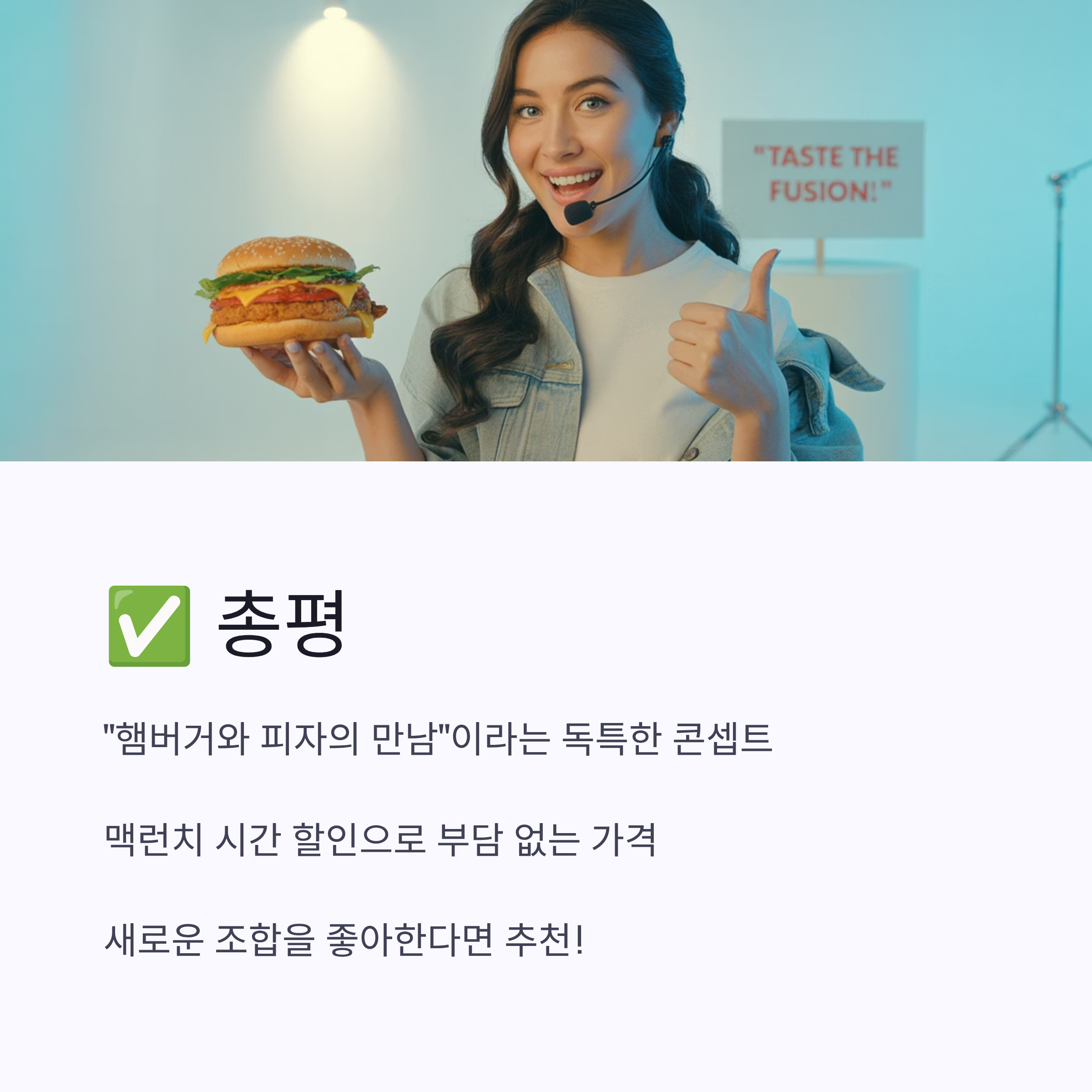 다만, 피자와 버거가 합쳐진 만큼 호불호는 있을 수 있어요. 피자 특유의 짭짤한 맛을 좋아한다면 만족도가 매우 높을 것 같네요.