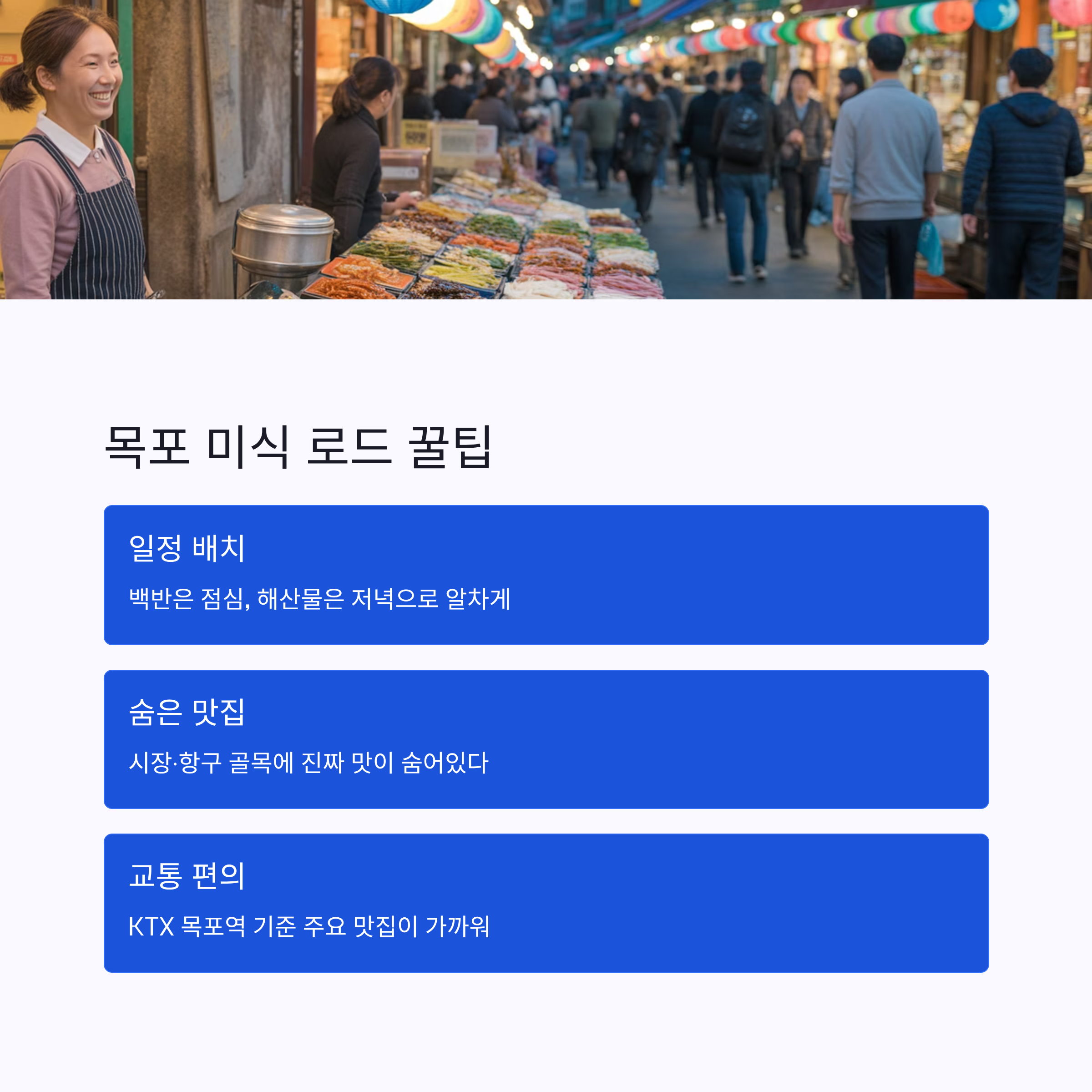 ✔ 목포의 맛은 시장·항구 골목에 숨어 있으니 꼭 둘러보자.