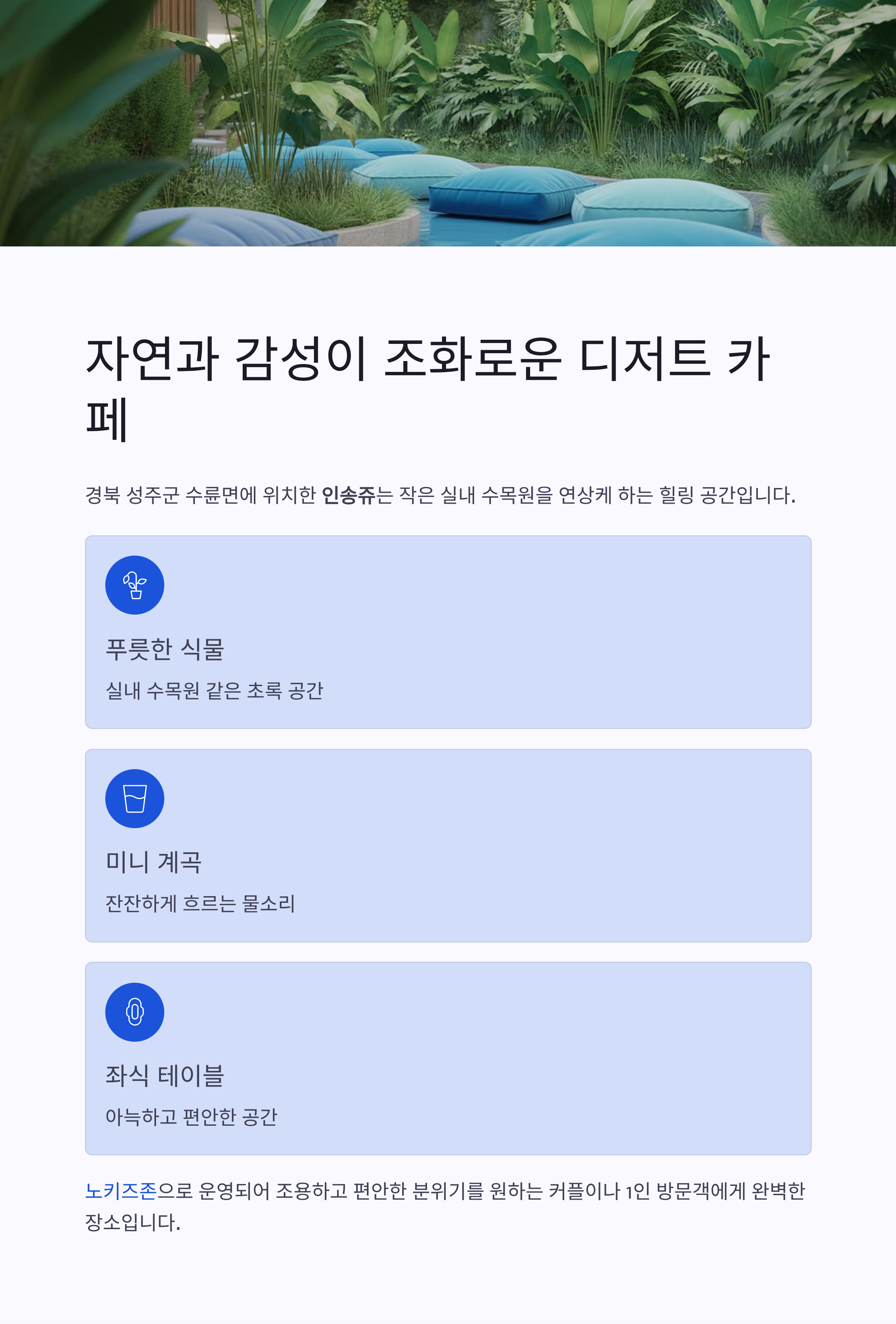 경북 성주군 수륜면에 위치한 **‘인송쥬’**는 자연과 감성이 조화롭게 녹아든 디저트 카페입니다.