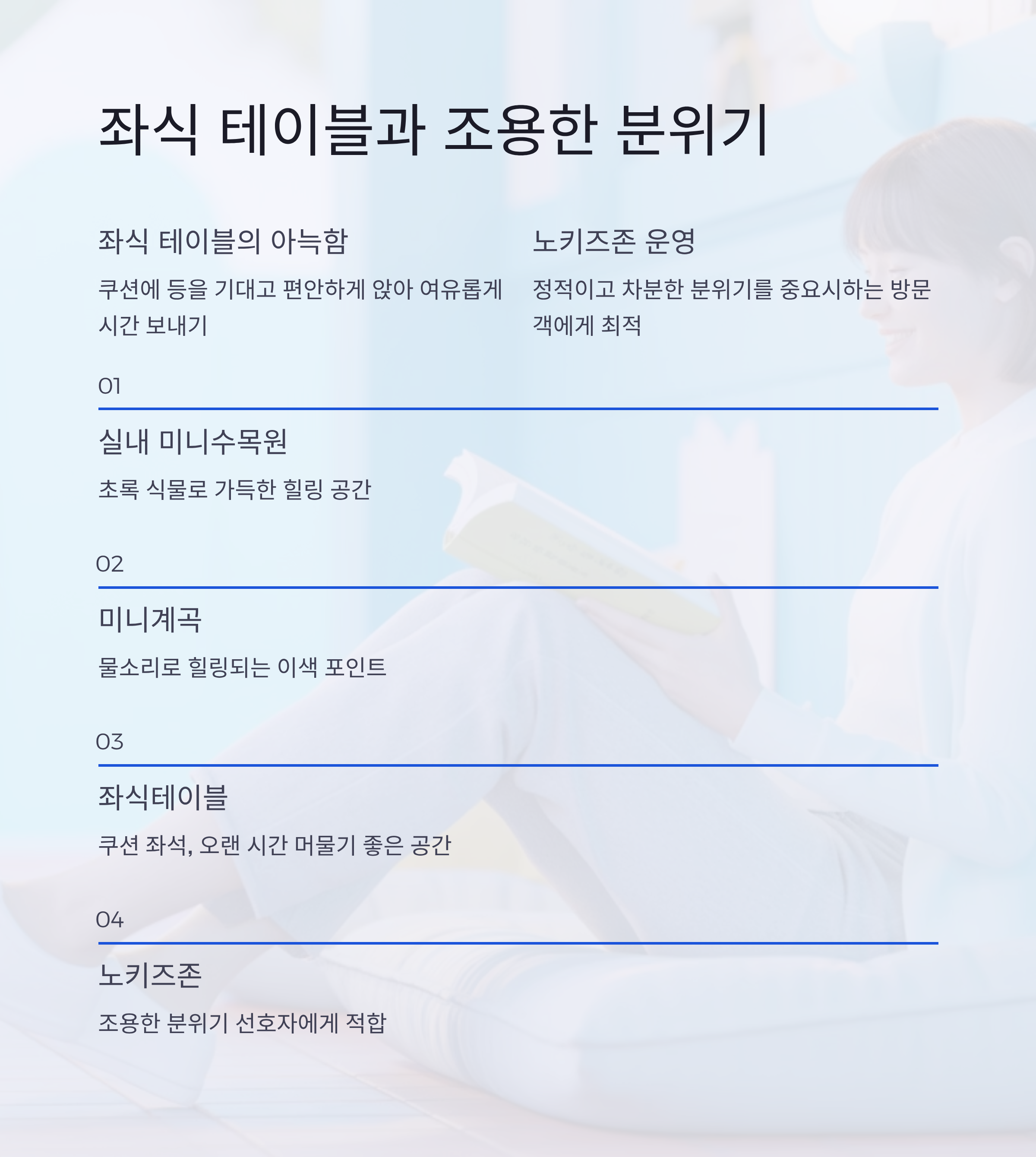 | 좌식테이블 | 쿠션 좌석, 오랜 시간 머물기 좋은 공간 |
