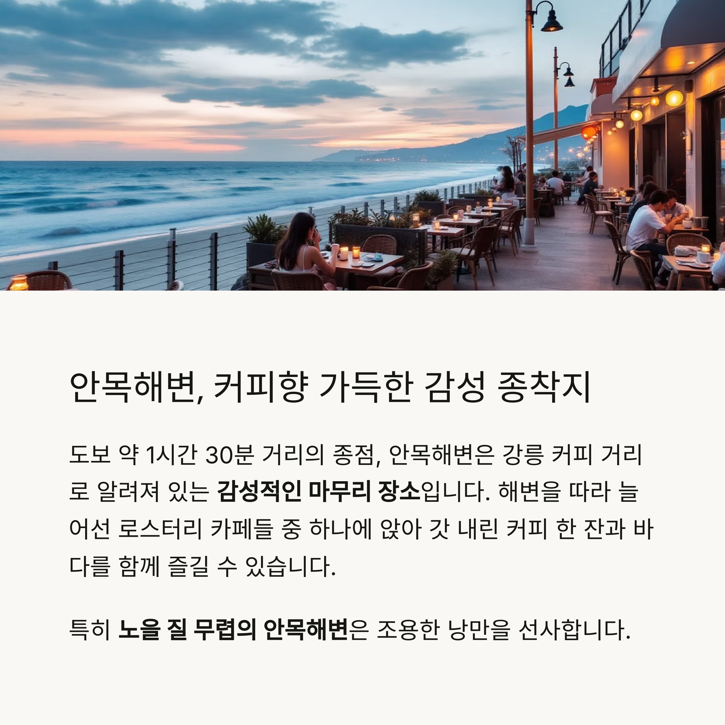 특히 노을 질 무렵의 안목해변은 조용한 낭만을 선사합니다.