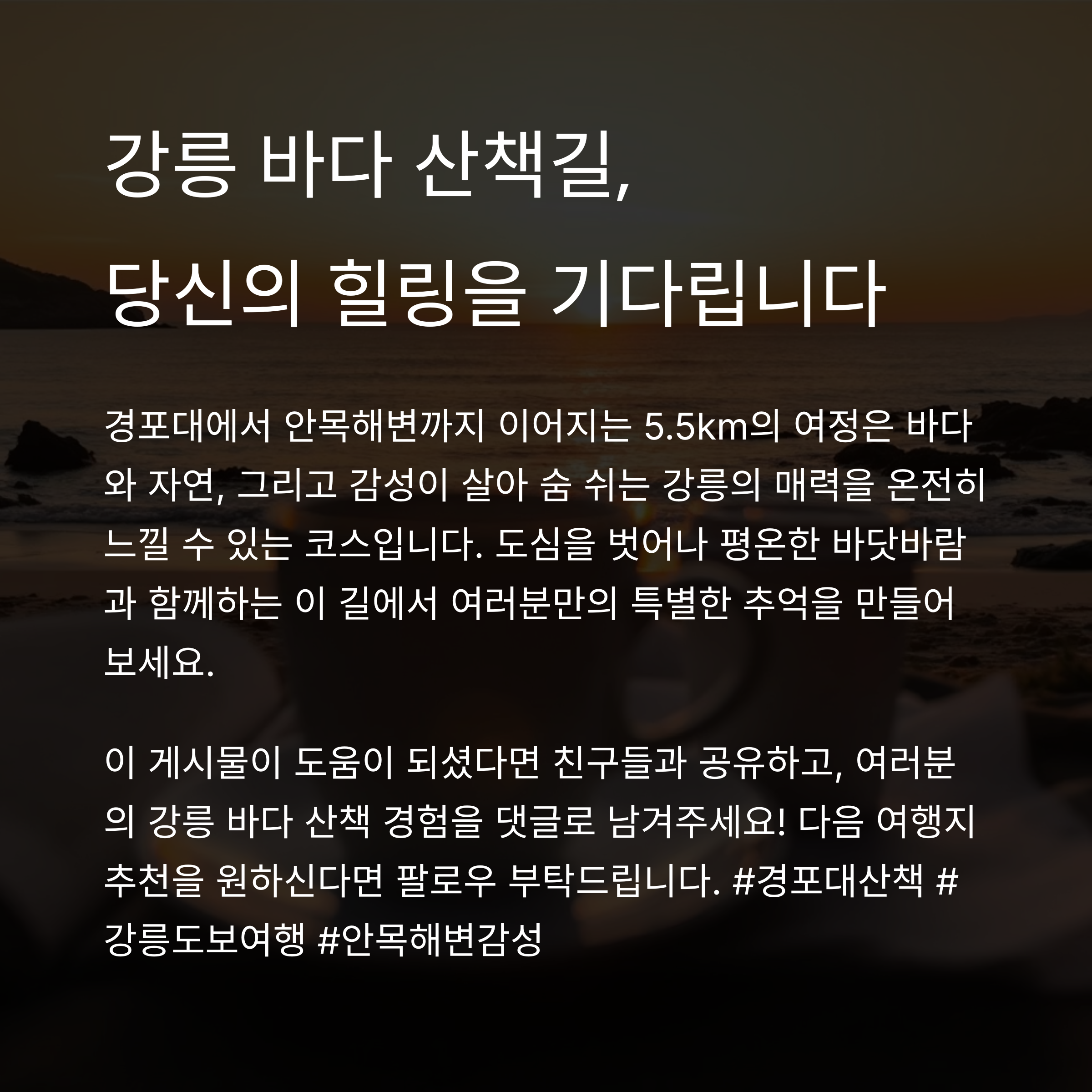 강릉은 바다와 자연, 그리고 감성이 살아 숨 쉬는 도시입니다. 그중에서도 경포대에서 안목해변까지 이어지는 길은