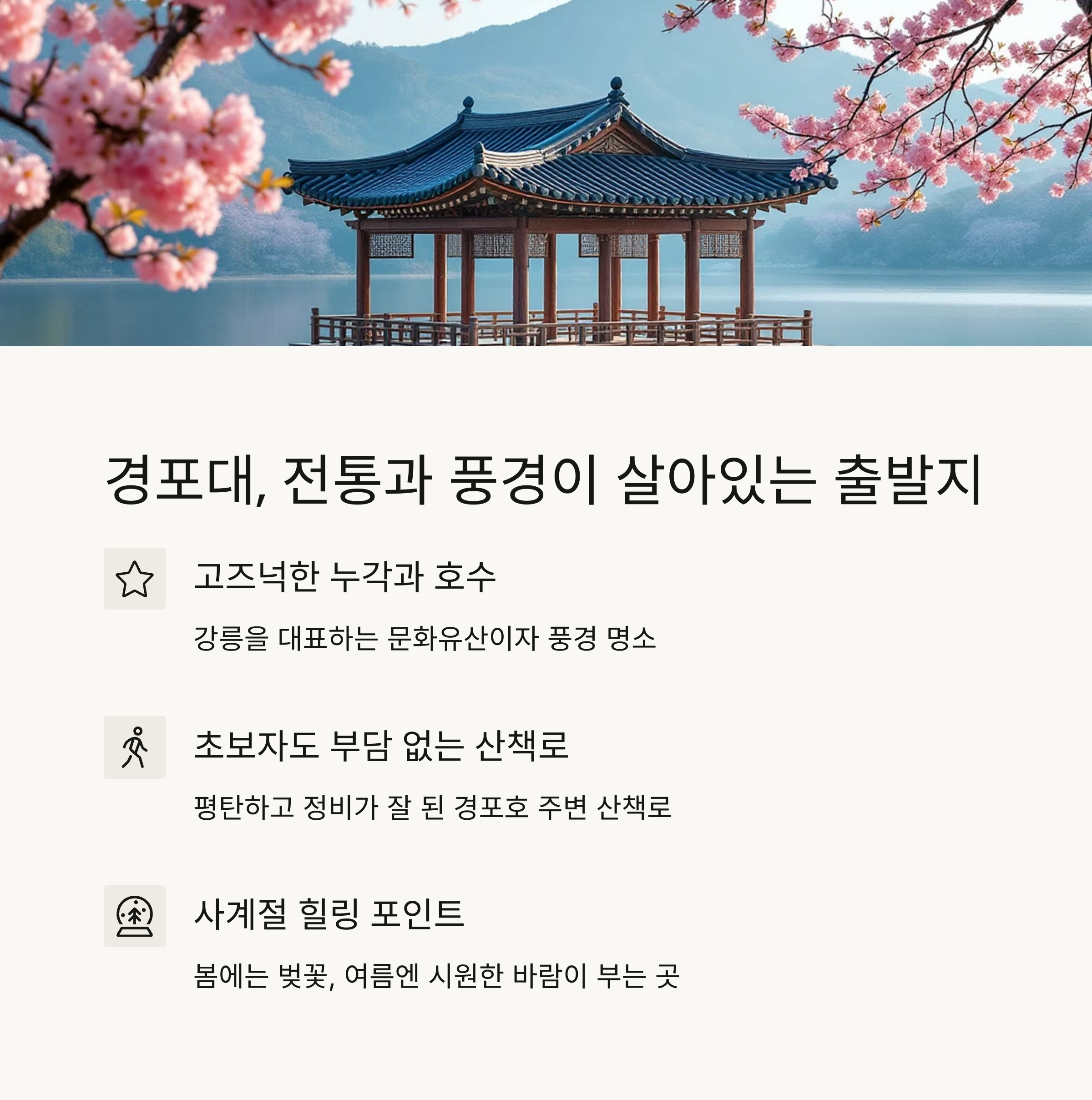 고즈넉한 누각과 호수, 탁 트인 바다가 한눈에 들어오며, 산책 시작점으로 완벽한 장소입니다.
