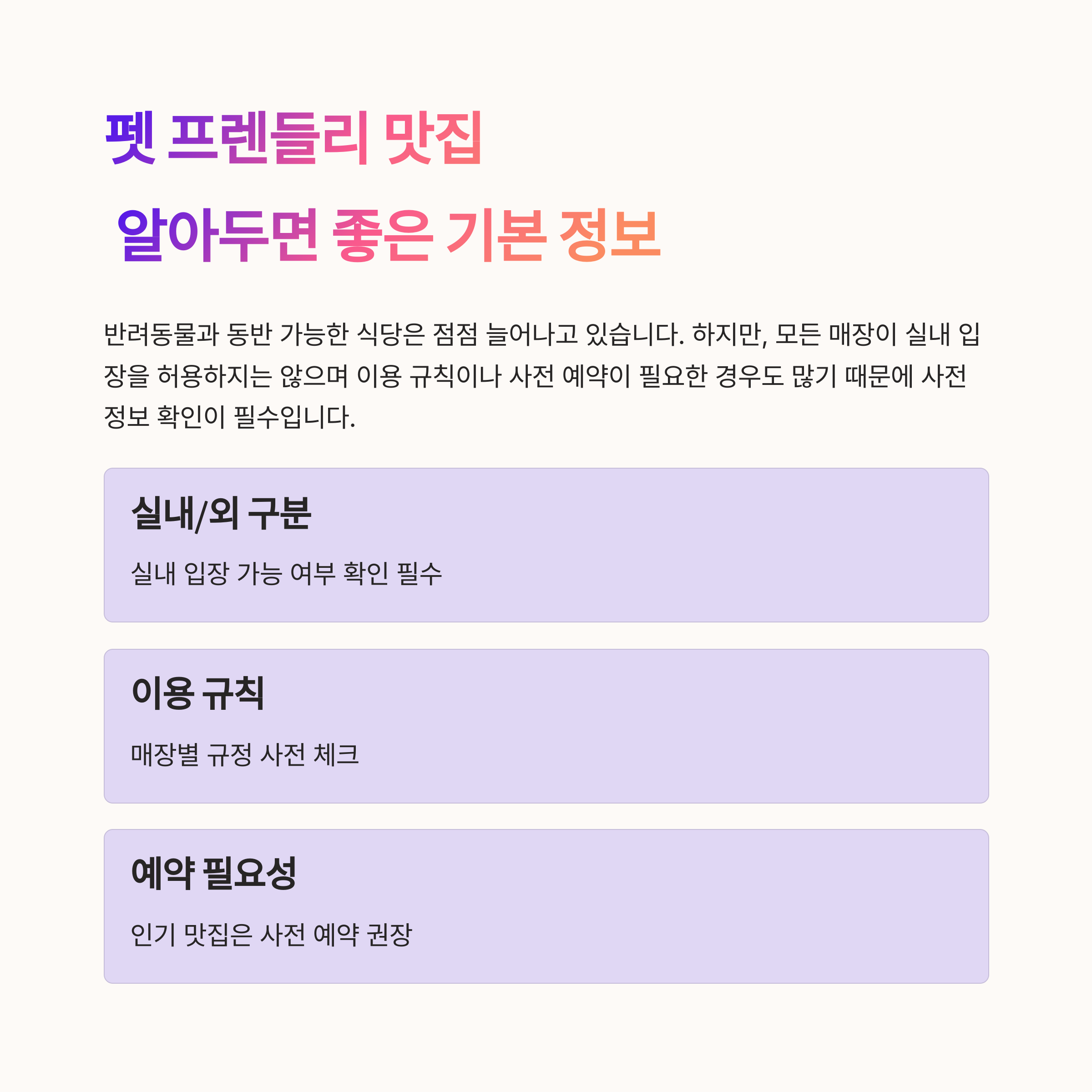 또한 타 손님과의 거리 유지, 짖음 조절, 배변 관리 등 기본 매너를 지키는 것이 중요합니다.