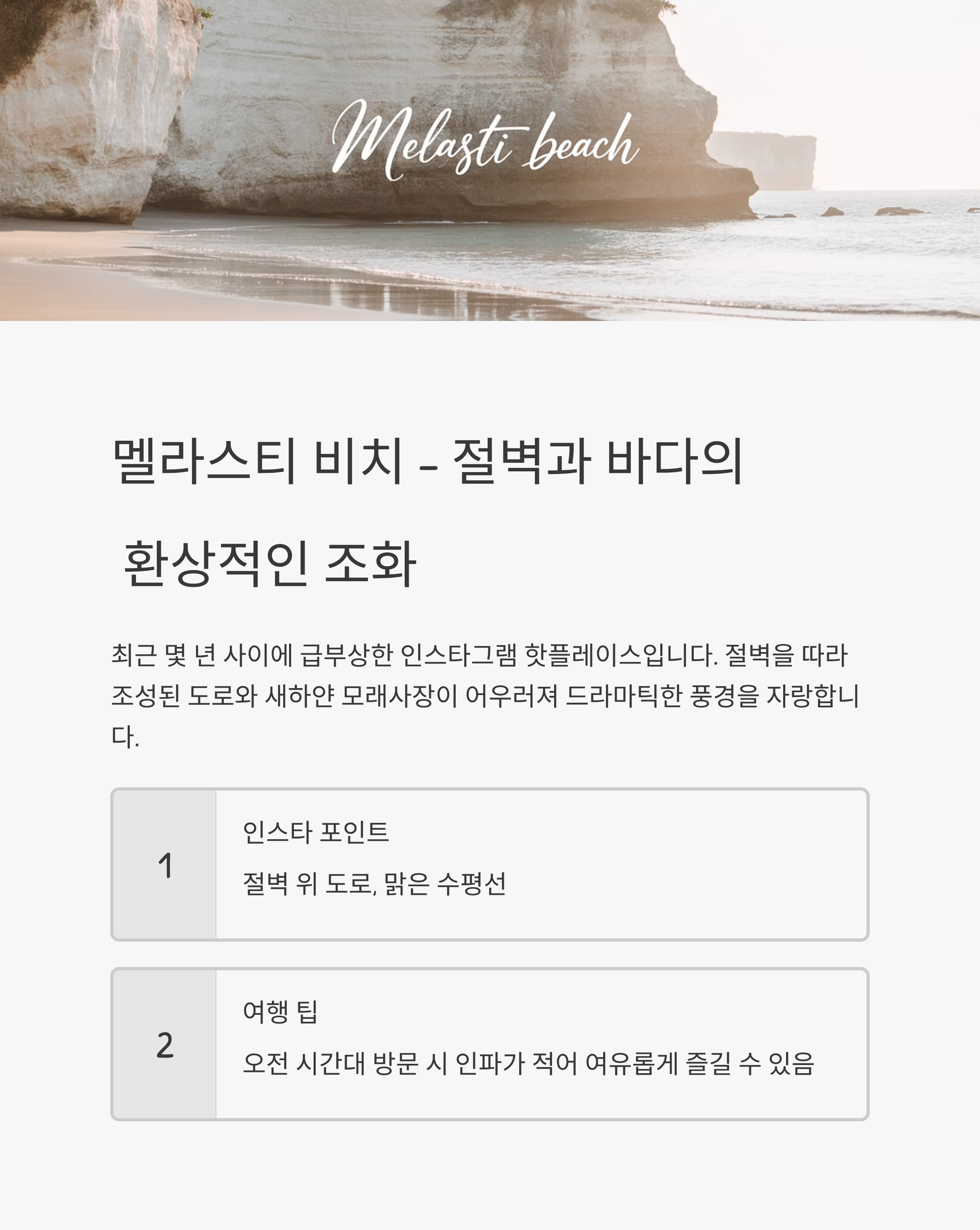멜라스티 비치 – 새하얀 절벽과 청량한 바다의 조화