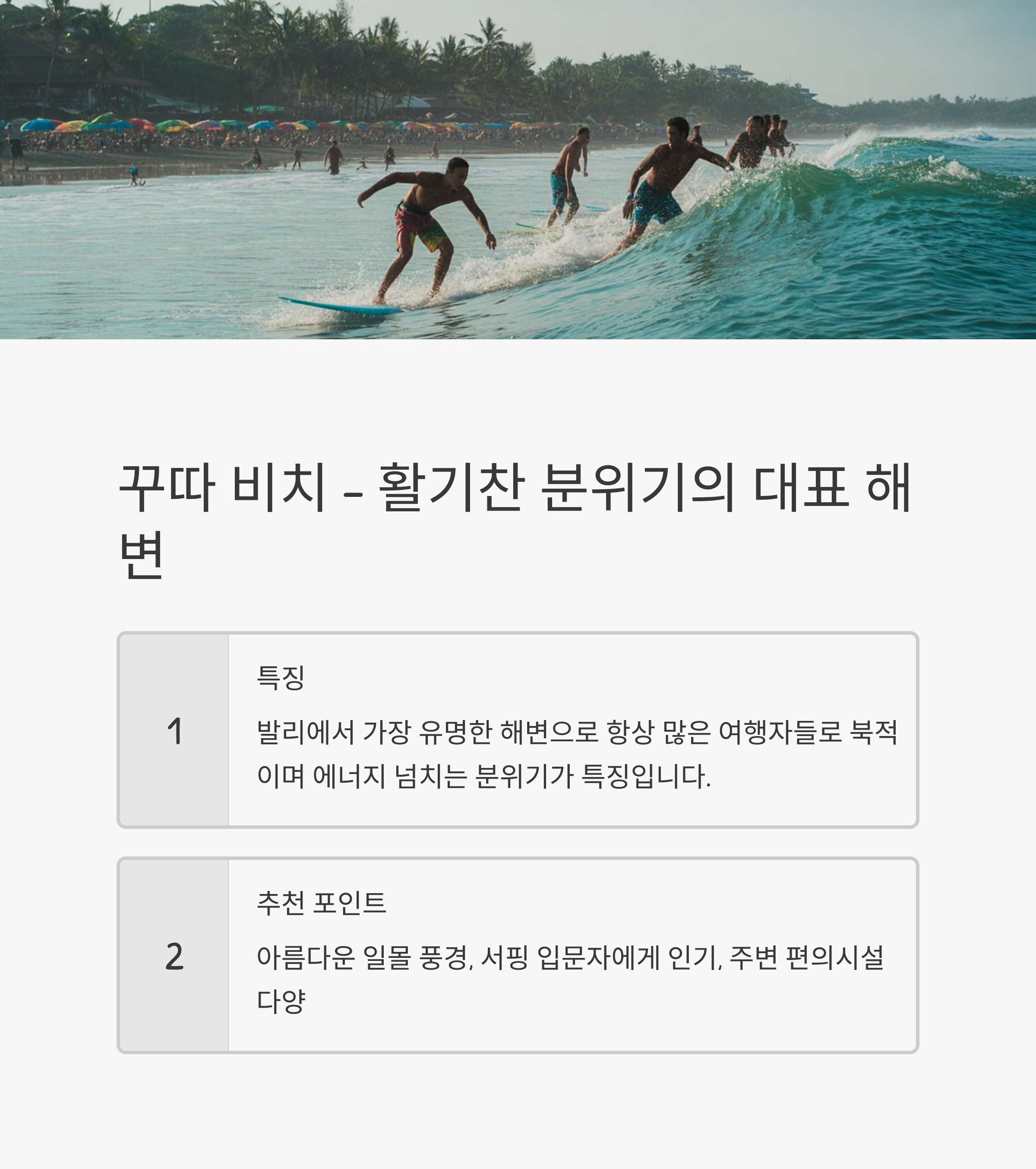 일몰 풍경이 아름답기로도 유명하며, 서핑 입문자에게 특히 인기가 많습니다.